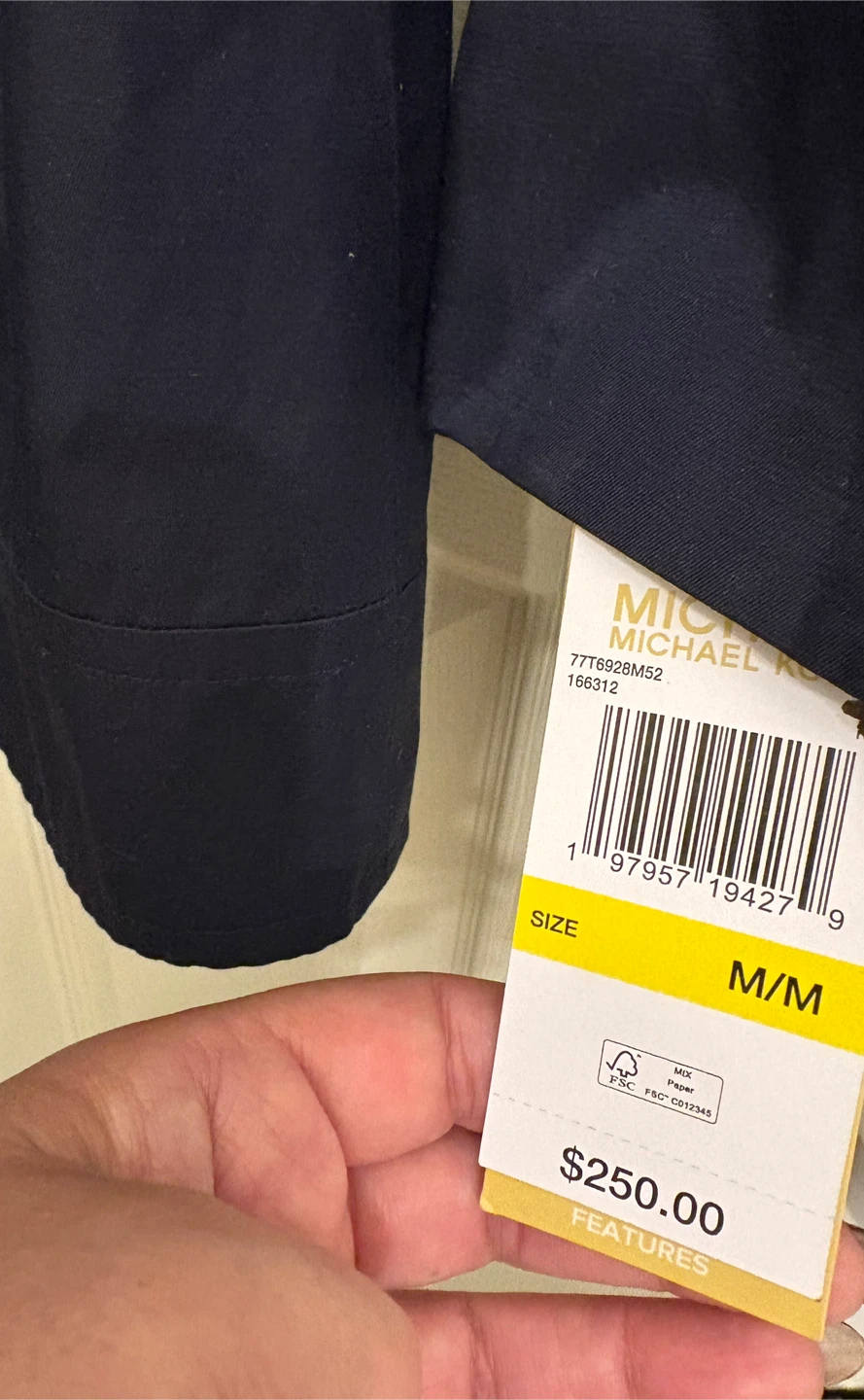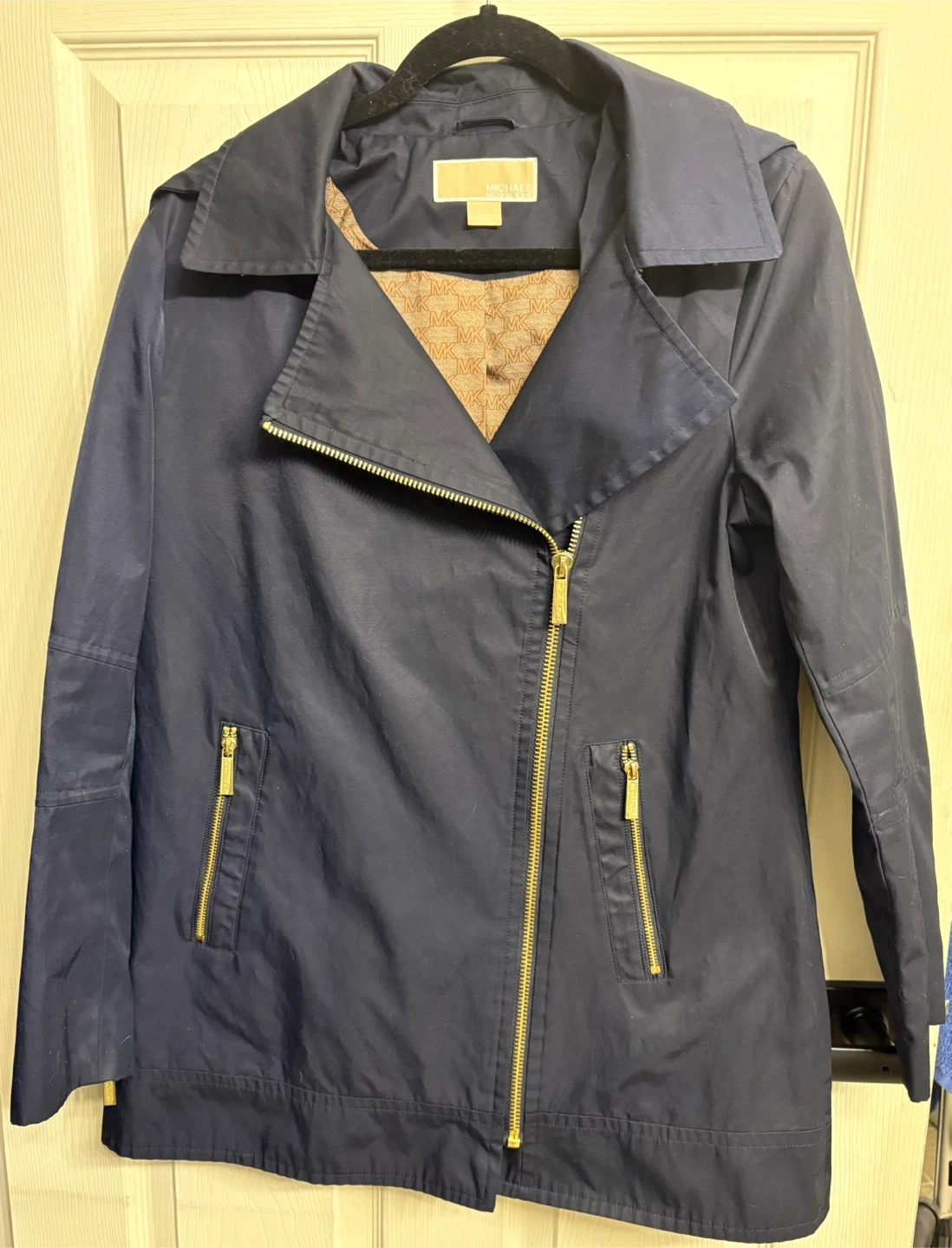 This is a Michael Kors jacket in a beautiful navy colour. It's a size M/M and features stylish gold zippers. Originally bought for $250.00. Perfect for spring or fall! It’s new, tags still on. Pick up in Chestermere.