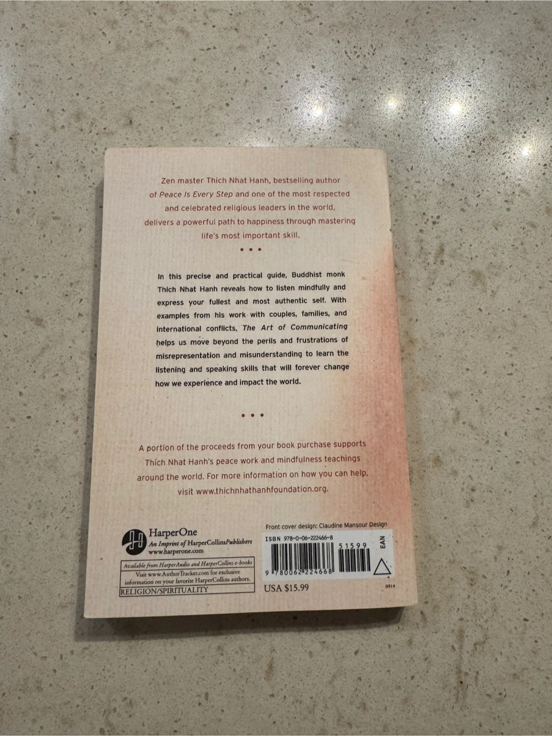 Selling "The Art of Communicating" by Thich Nhat Hanh! This book is a national bestseller and offers insightful teachings on mindfulness and communication. It explores how to listen mindfully and express yourself authentically. A portion of the proceeds supports peace work and mindfulness teachings around the world
