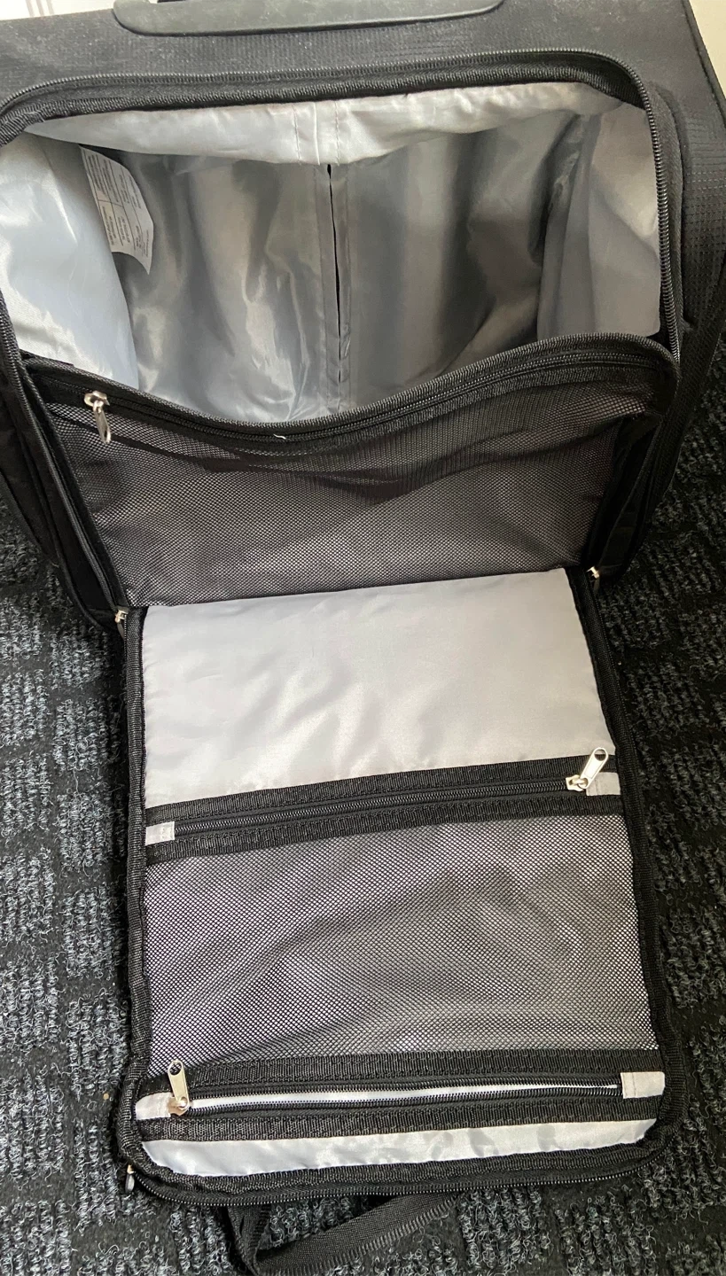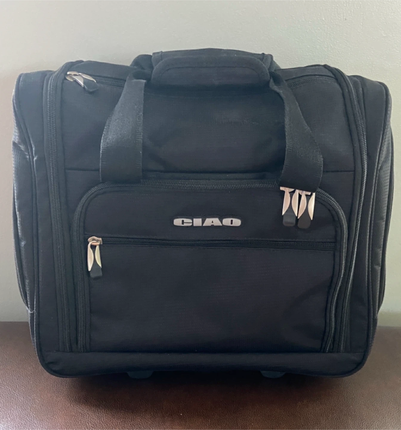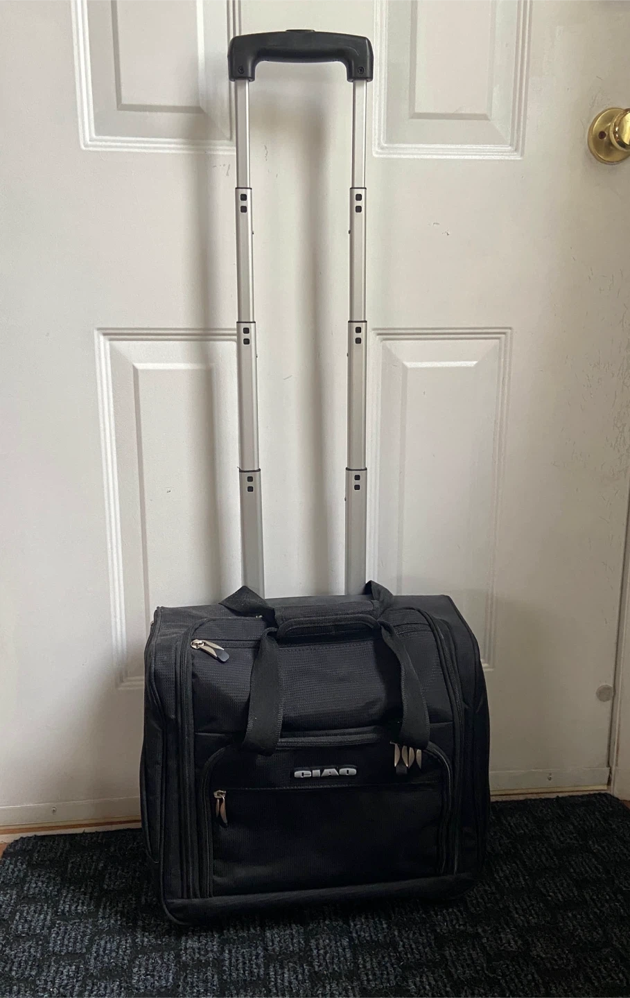 Selling a black rolling carry-on bag from CIAO. It has a retractable handle and multiple compartments for easy organization. Great for travel or everyday use!
