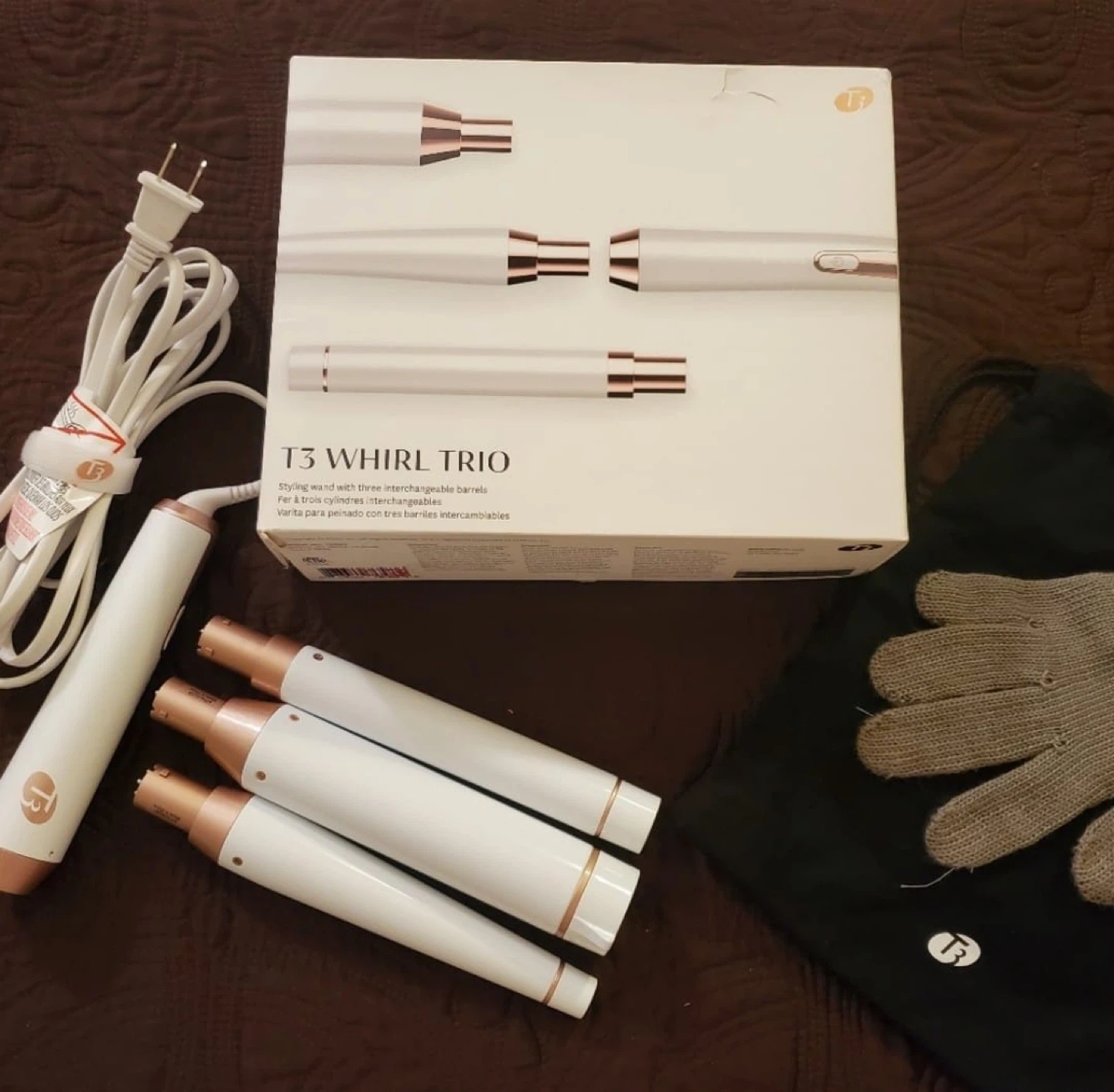 10Selling a T3 Whirl Trio styling wand with three interchangeable barrels. It comes with the heat-resistant glove for added safety during styling. The box is included!