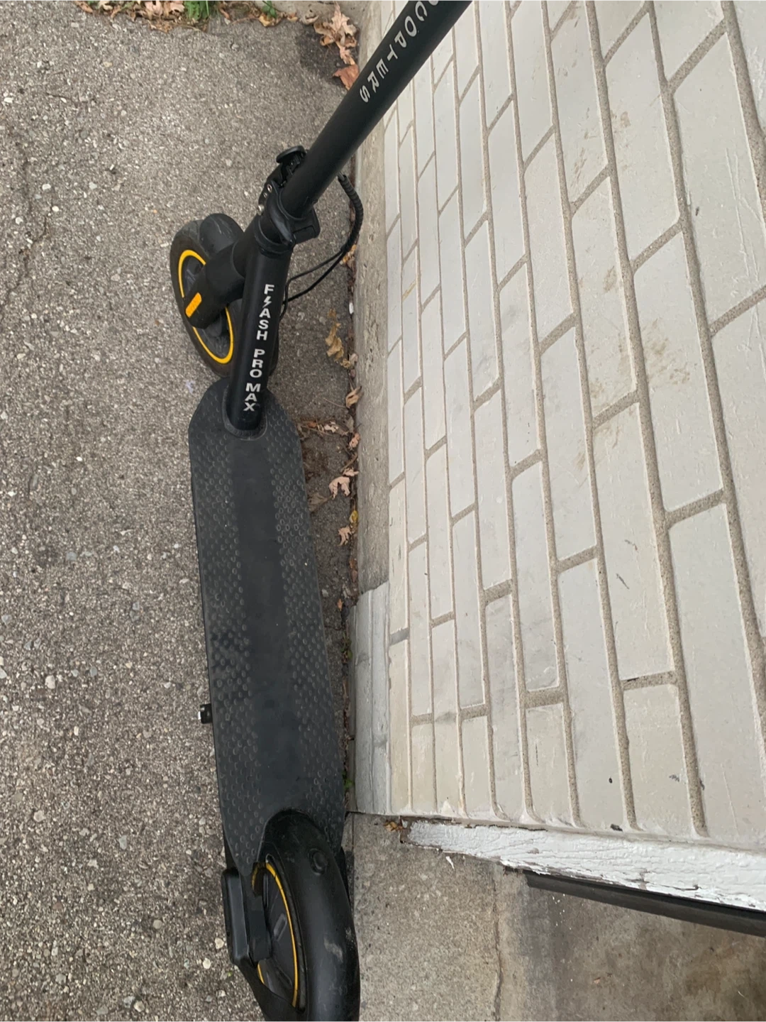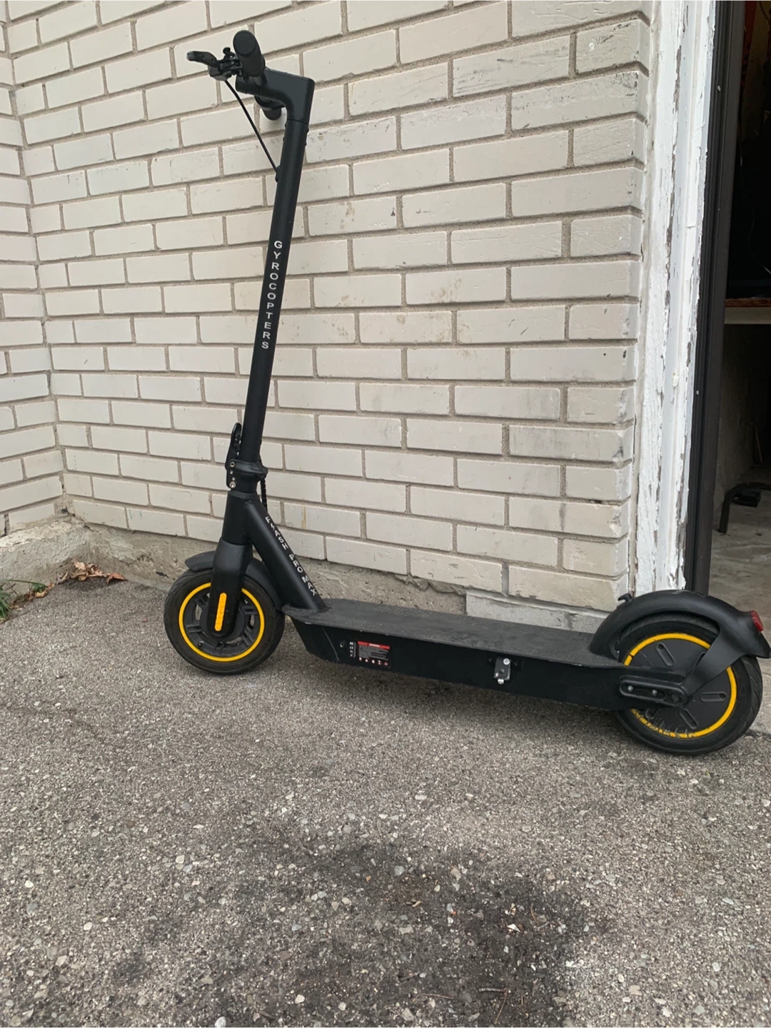 Selling a Gyrocopters Flash Pro MX electric scooter in black with yellow accents. It's in good condition and ready for some fun rides around town! A great way to get around and enjoy the outdoors