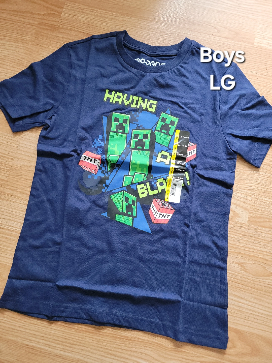 36Here's a Minecraft boys t-shirt in size LG (10-12). The shirt is blue and features a Creeper and TNT block design. Perfect for any young Minecraft fan!