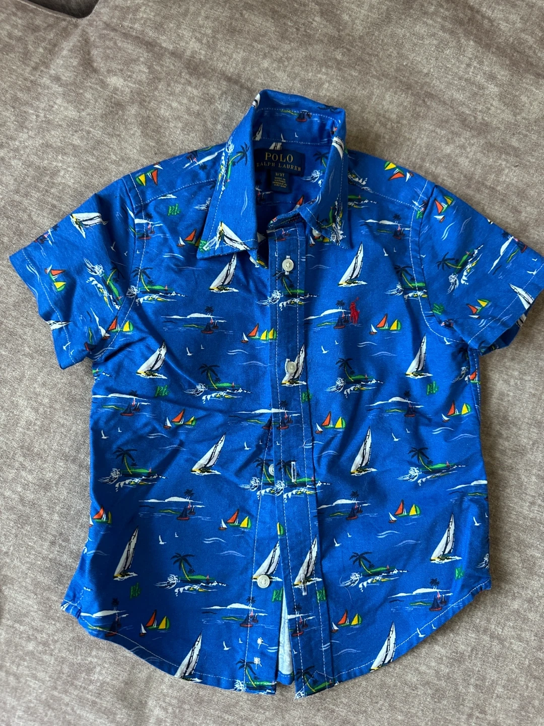 Here's a cute Polo Ralph Lauren shirt for your little one! It's a size 3/3T and features a fun sailboat and palm tree print on a blue background. Perfect for a casual day out!