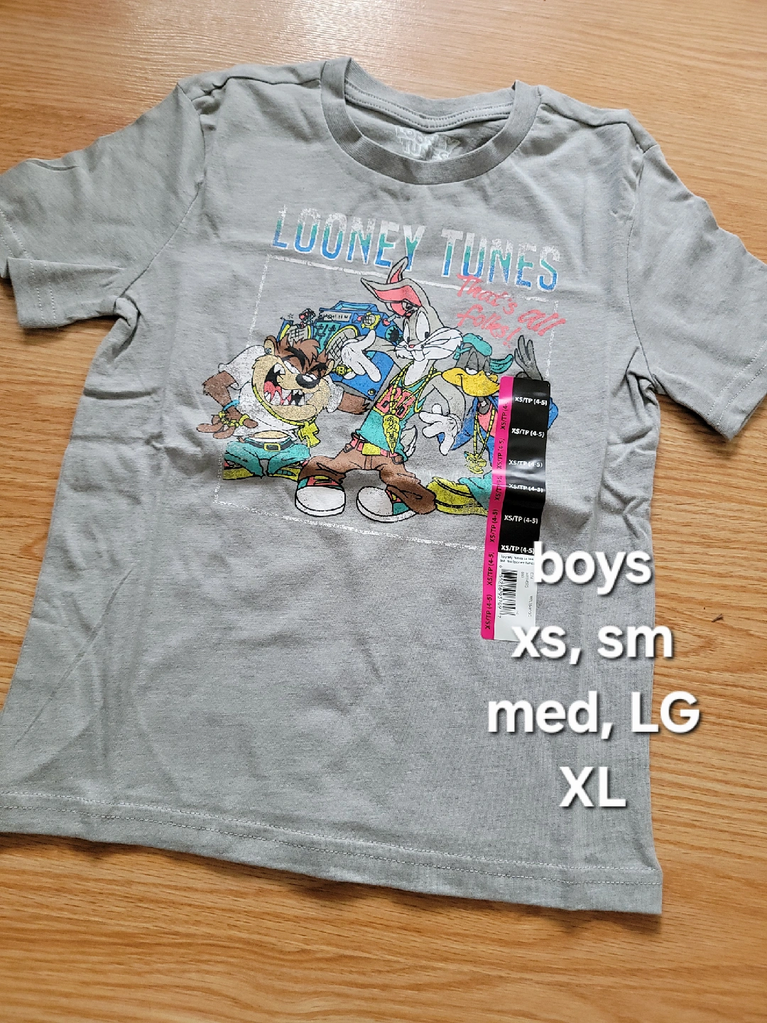 Selling a cute Looney Tunes t-shirt for boys! It's a light grey colour and features Taz, Bugs Bunny, and Daffy Duck. The size is XS-XL