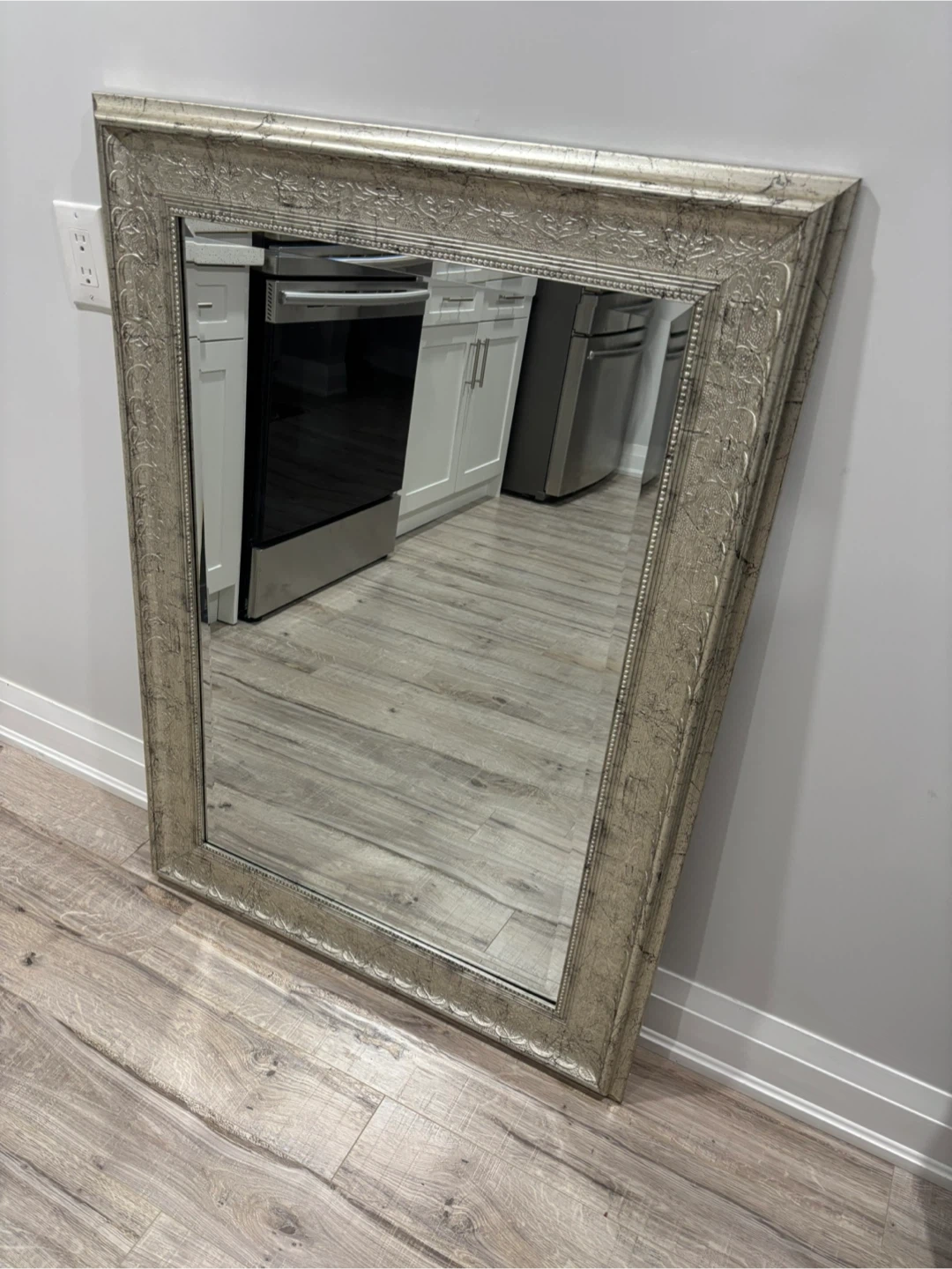 Selling an ornate framed wall mirror. It's in great condition and would look lovely in any room of the house! The frame has a beautiful, detailed design and is champagne/silver in colour.