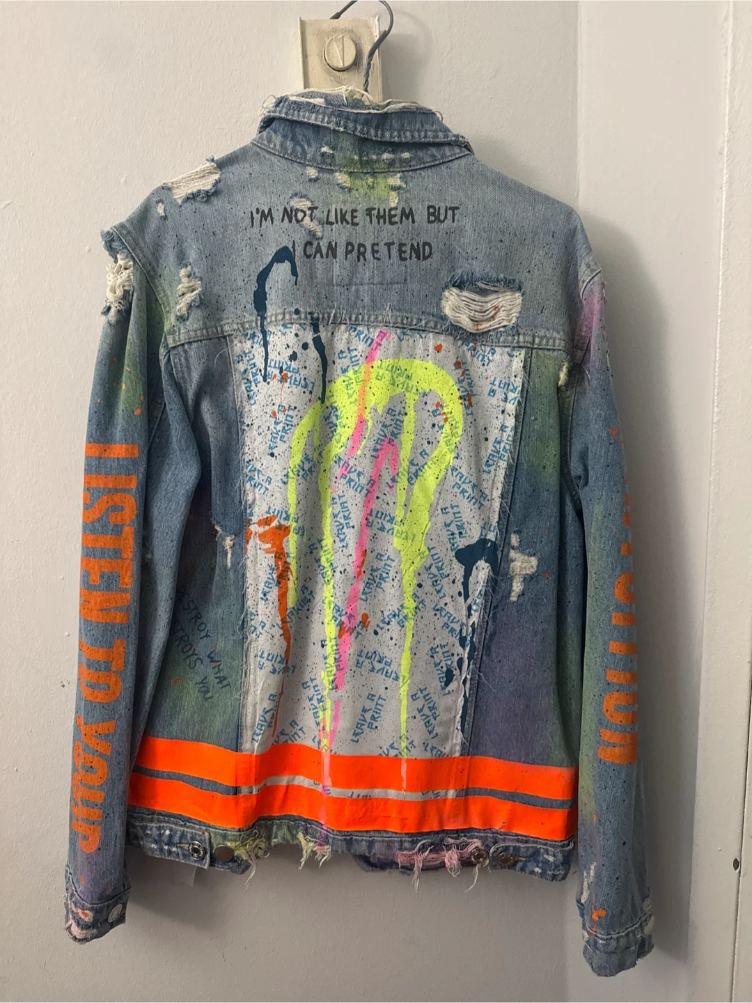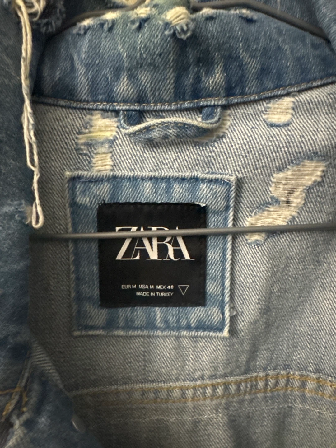 10Selling a Zara denim jacket, size medium. It's a light wash with a distressed look and some unique paint detailing. It's in good condition and ready for a new home!
