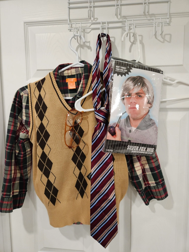 25Selling a costume set that includes a silver wig, shirt, vest, tie, and glasses. Perfect for a fun costume party or event!
