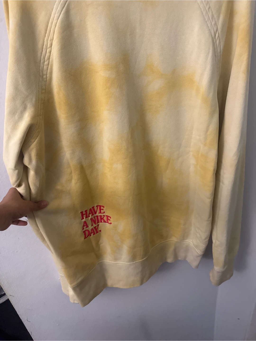 Selling a super cute Nike sweatshirt from the "Have A Nike Day" collection! It's a tie-dye style in a soft yellow colour. Size is M. Perfect for a casual, comfy look!