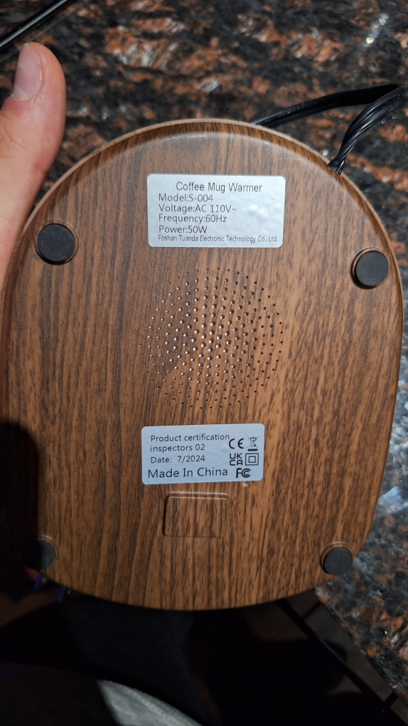 Keep your coffee or tea warm with this handy mug warmer! It's a model S-004 and operates at 110V with a power of 50W. The manufacturing date is July 2024
