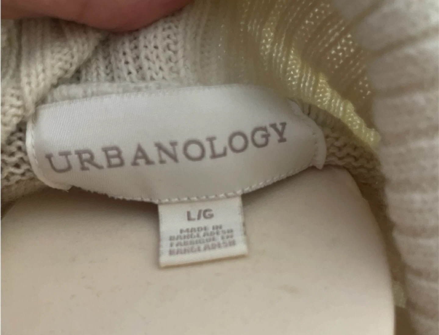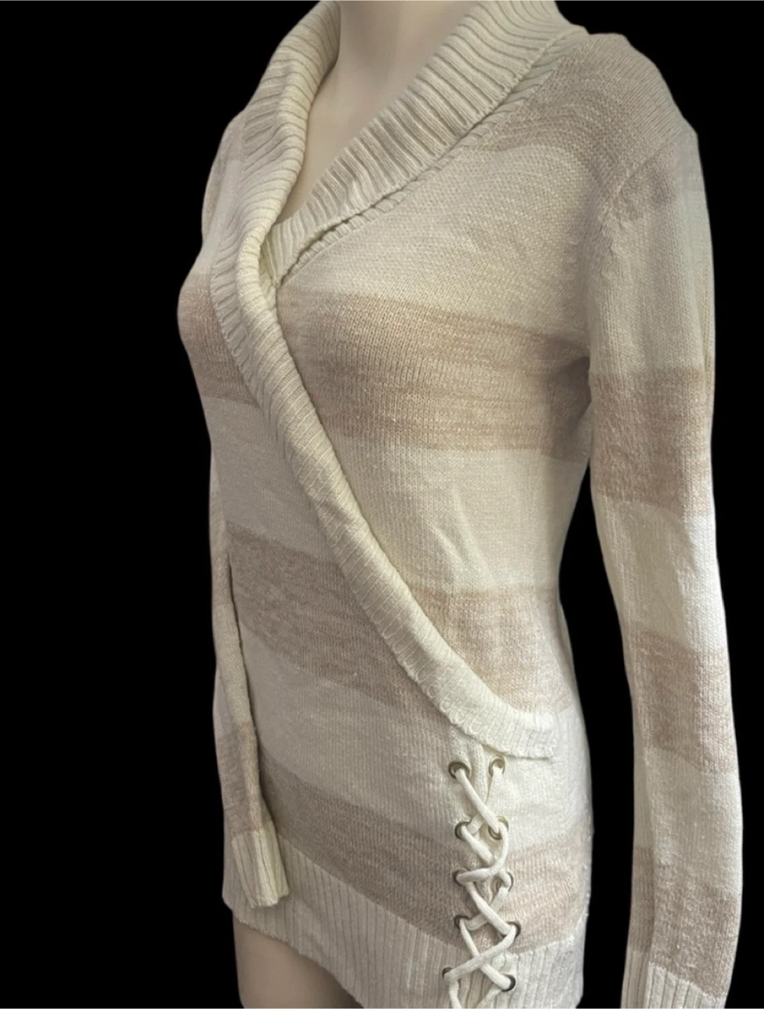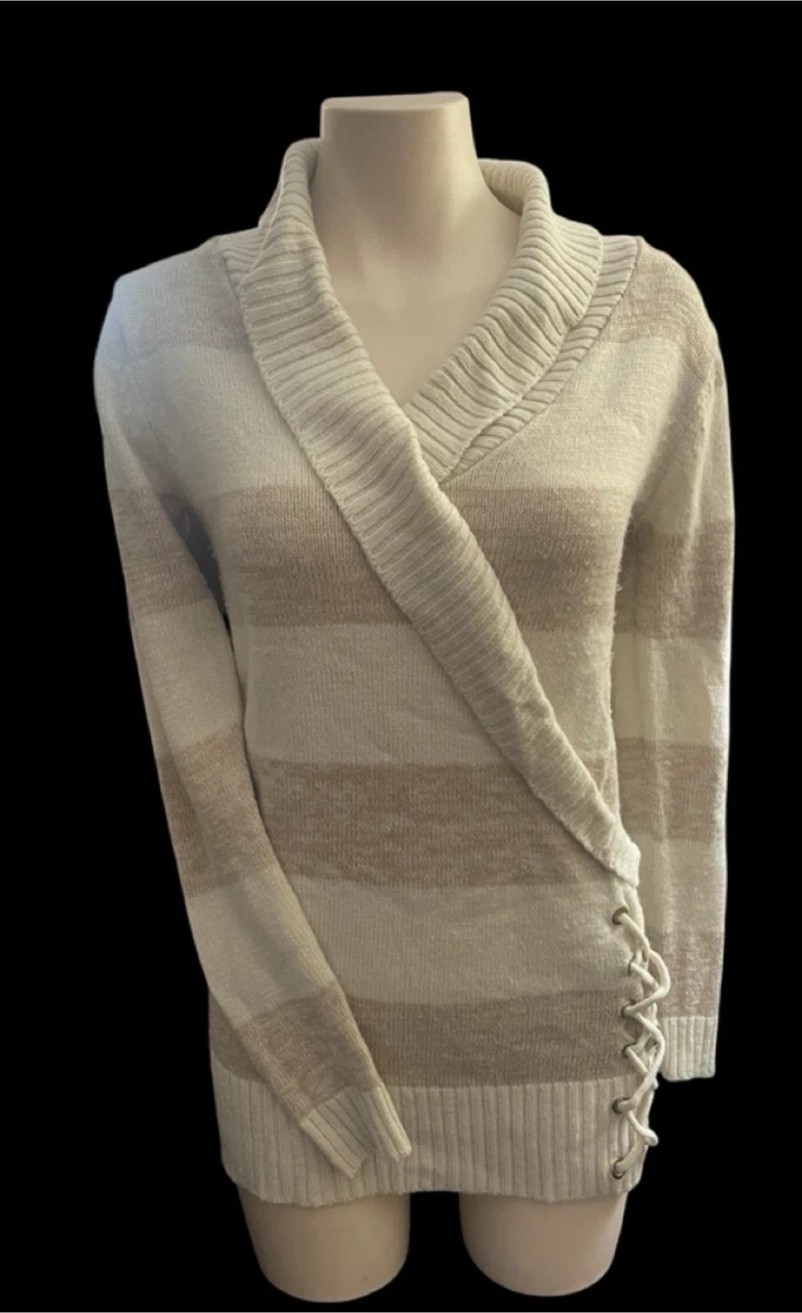 Cozy Urbanology sweater in a size large! It features a stylish wrap design with lace-up detailing on the side. The neutral striped pattern makes it a versatile addition to any wardrobe. Lobby Pick Up