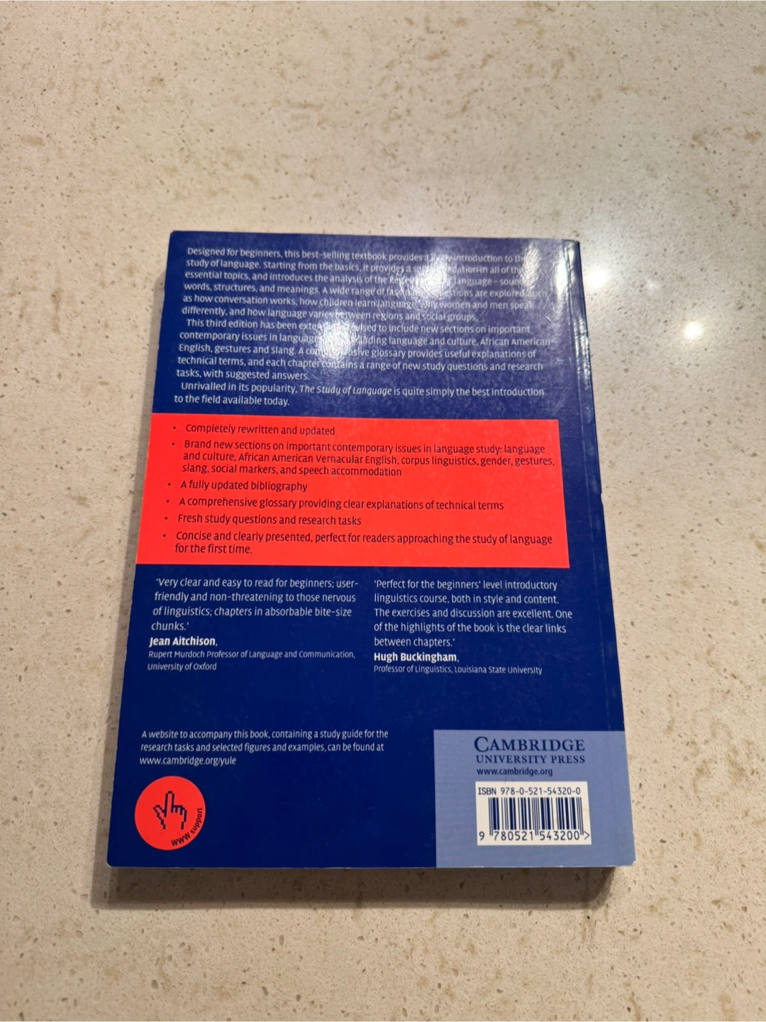 Selling "The Study of Language" by George Yule, Third Edition! This book is thoroughly revised and updated, perfect for anyone diving into linguistics or language studies. It's designed for beginners and provides a comprehensive introduction to the field, covering everything from the basics to more complex topics. A great resource for students and researchers alike!