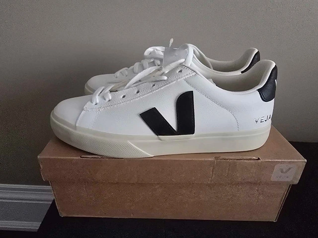 20Size women 10, men 8. Veja Campo ChromeFree Leather Extra-White Black unisex shoes in excellent condition! These stylish and eco-conscious sneakers feature a sleek design with a white leather upper and a contrasting black 'V' logo. These size 41 shoes have only been worn a few times and are in fantastic shape.
