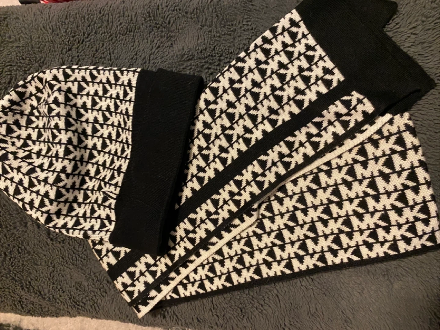 Here's a stylish Michael Kors hat and scarf set! The set features the MK logo pattern in black and white. Perfect for staying warm and fashionable during the colder months( New)