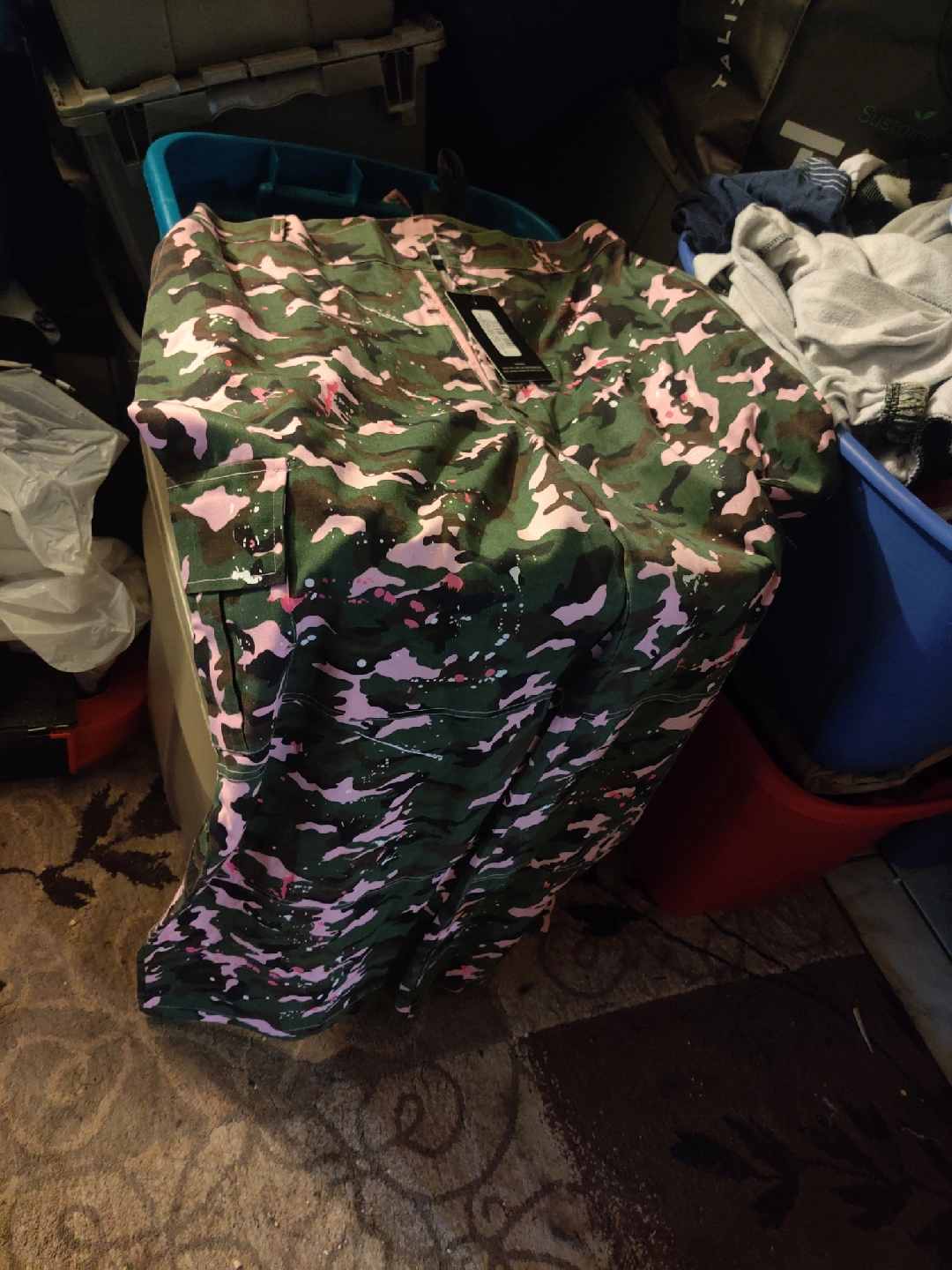 Selling a pair of PrettyLittleThing Petite Pink Paint Splatter Cargo Trousers in US size 8. These pants feature a unique pink camouflage pattern with a paint splatter design. They are perfect for adding a stylish and edgy touch to your wardrobe!