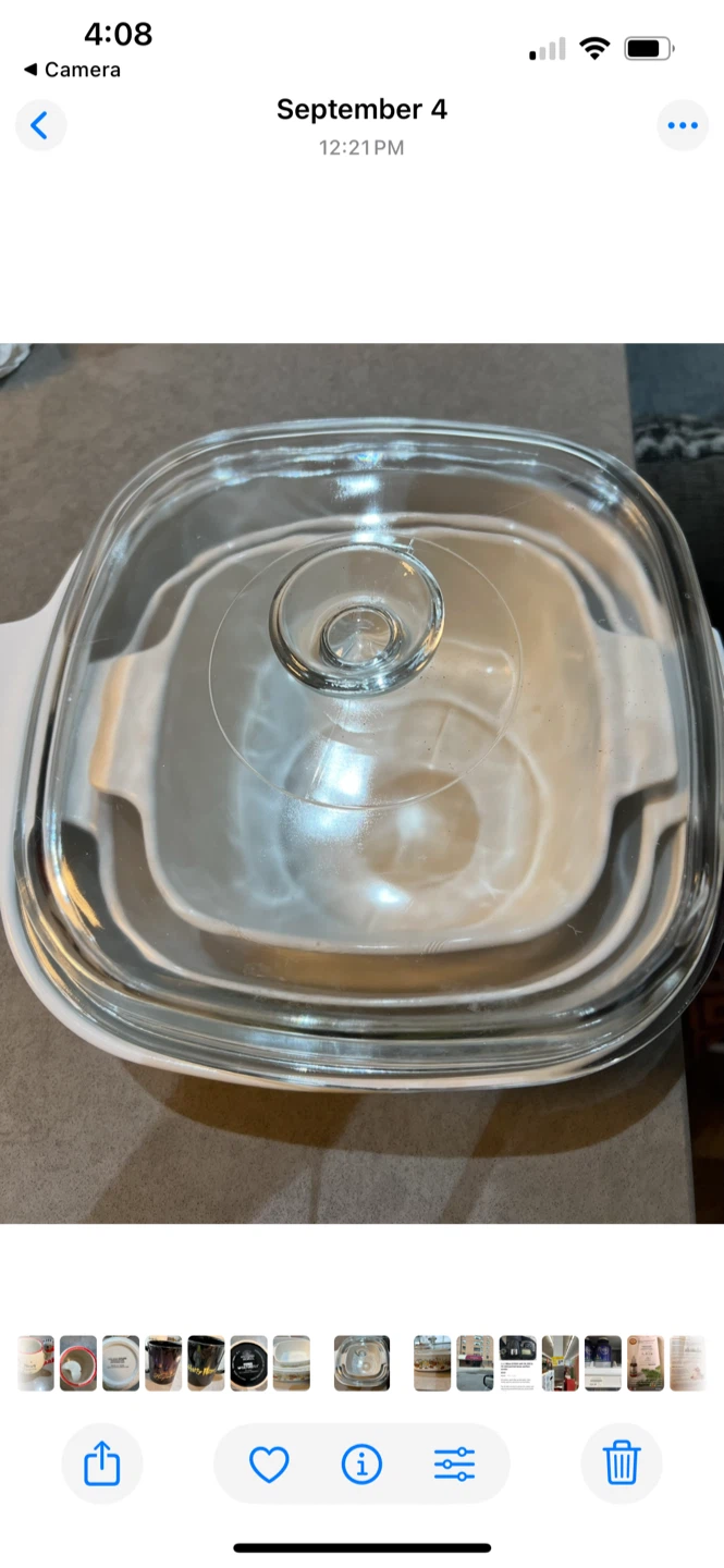 Selling a set of Corning Ware casserole dishes. They come with a lid. The dishes feature a lovely vegetable pattern. Great for baking and serving!