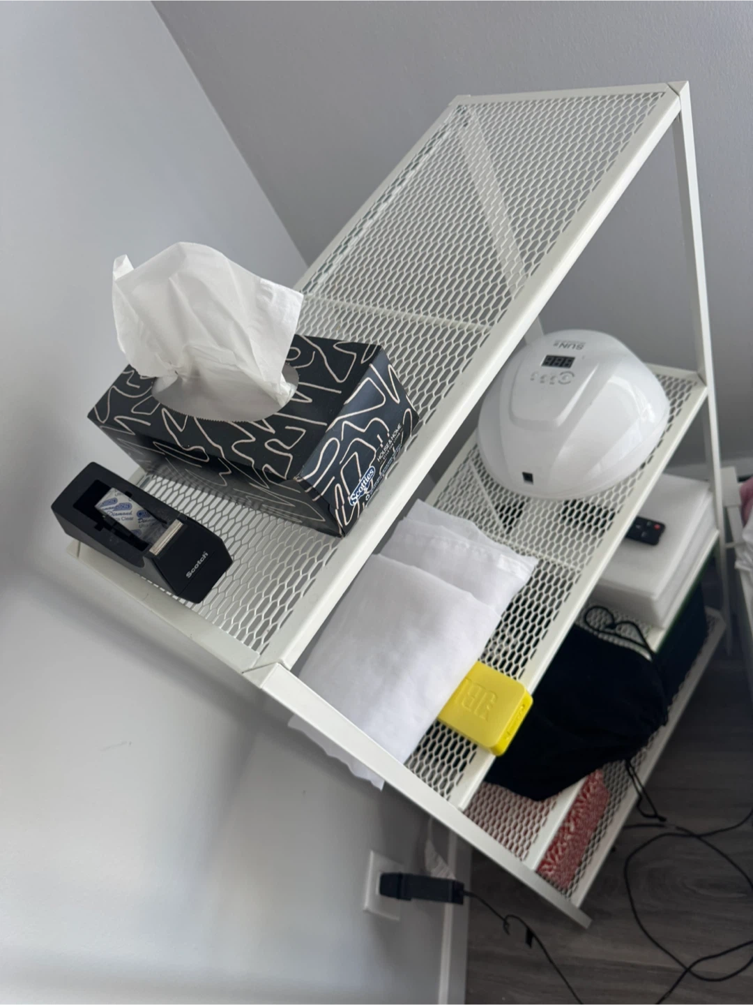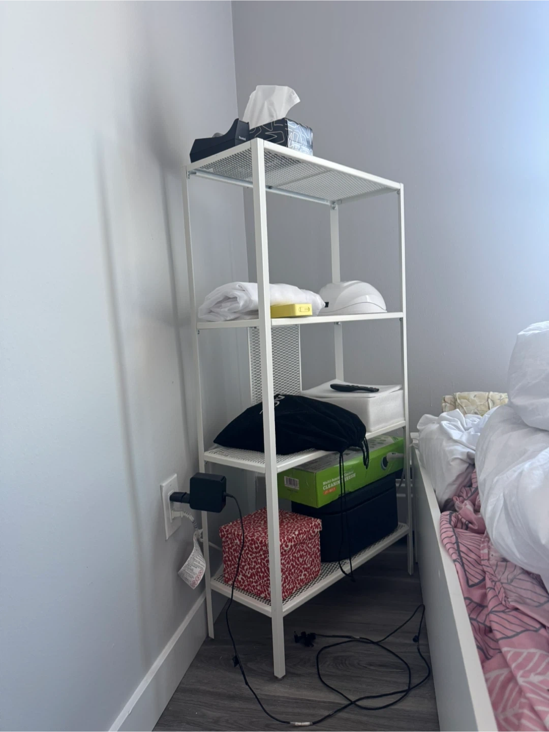 Selling a handy white metal shelf! Great for extra storage in any room. It's in good condition and ready for a new home