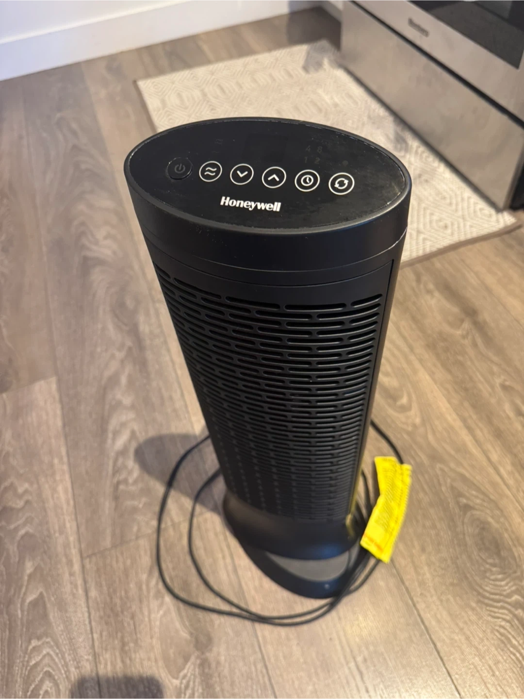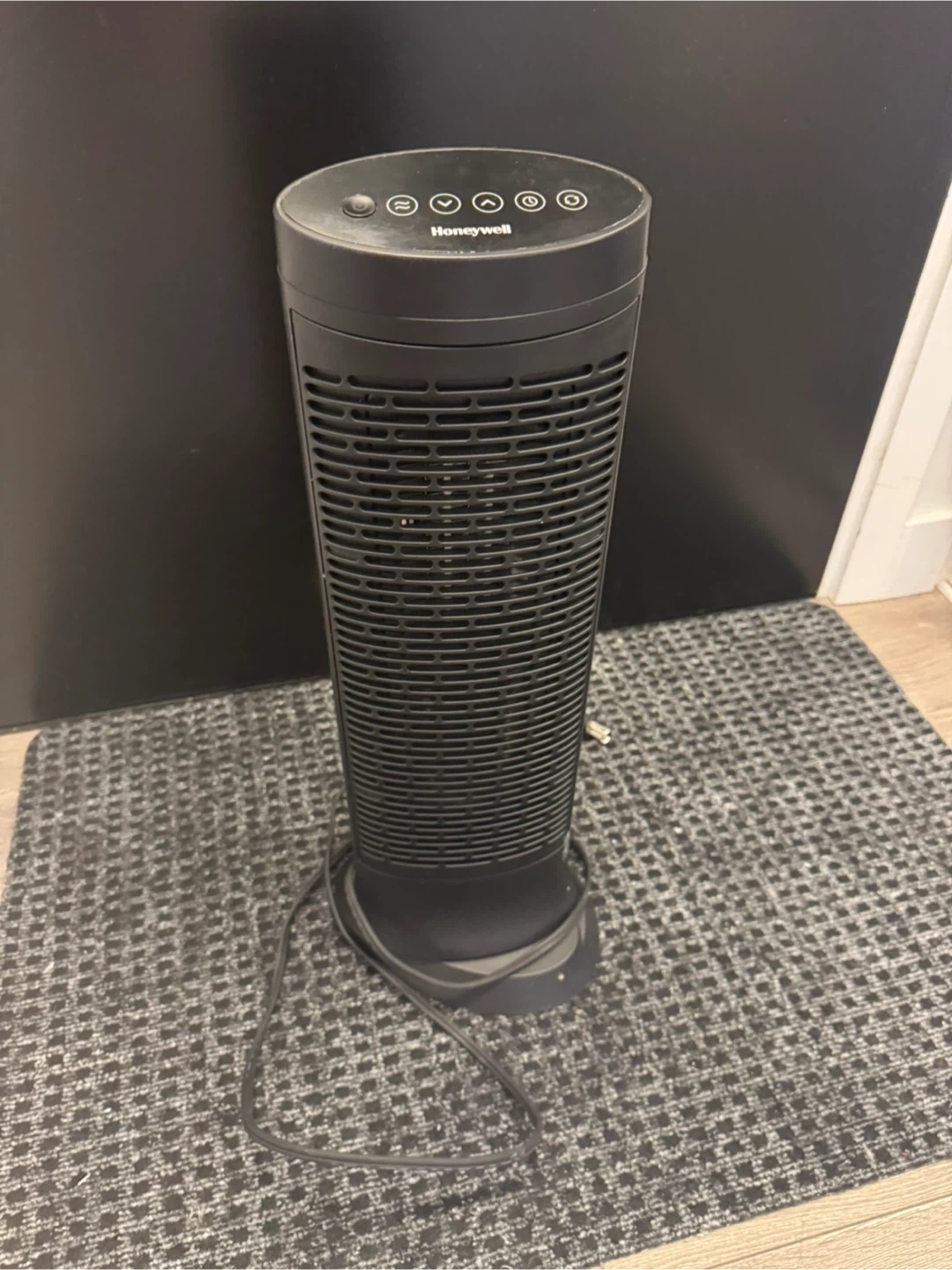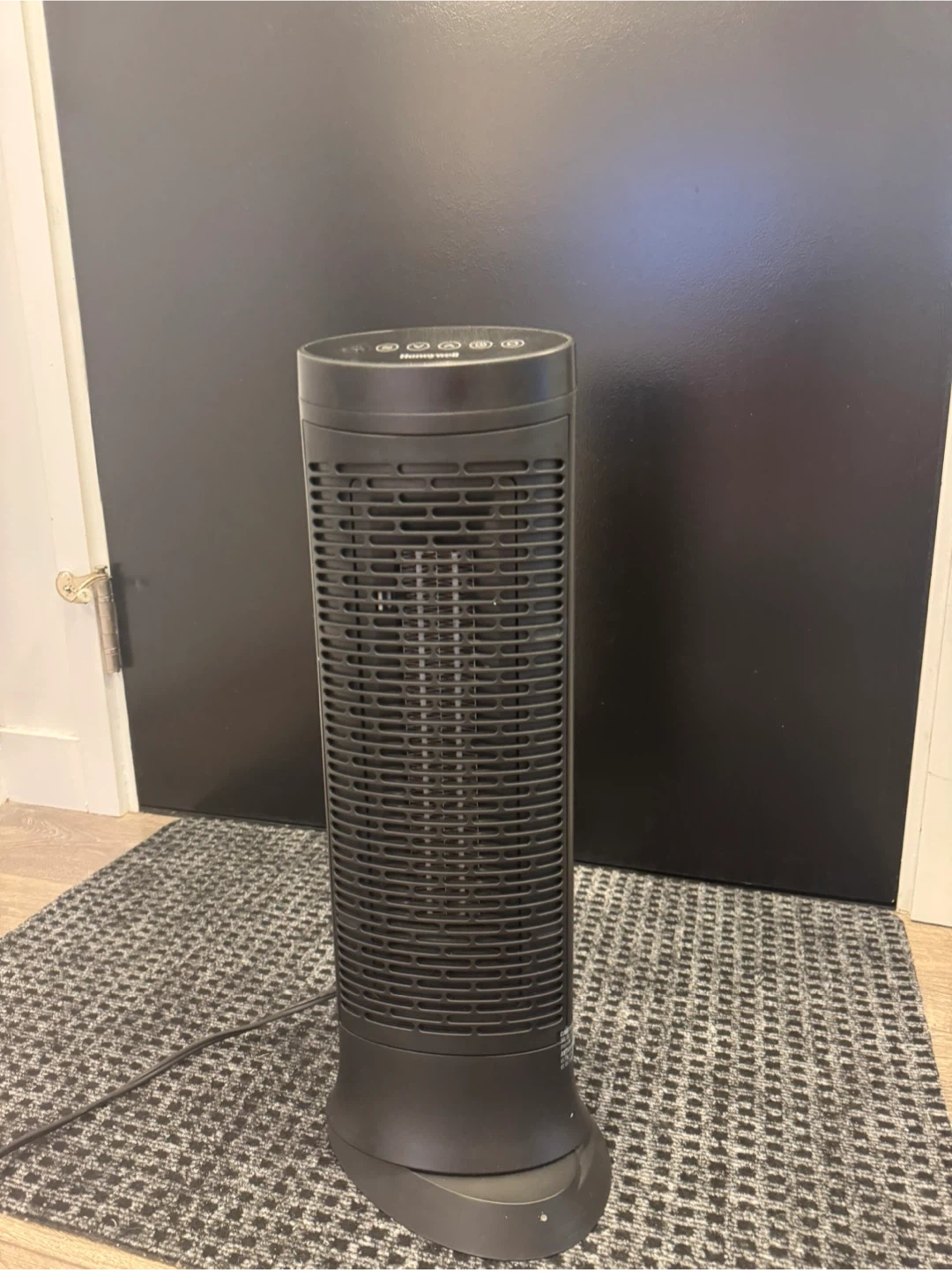 Selling a Honeywell tower heater in black. It's in great condition and ready to keep you warm! Perfect for small spaces and easy to use