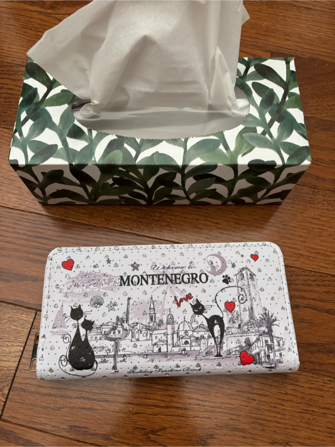 Cute wallet with a unique Montenegro cat print design! Tissue box for size reference