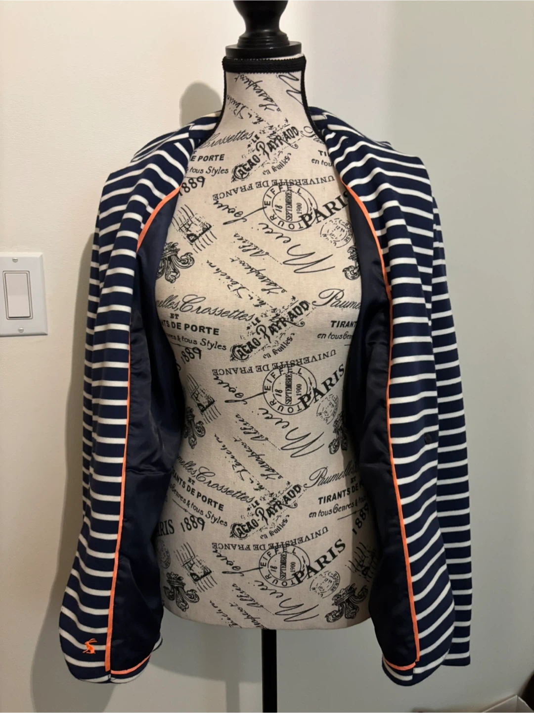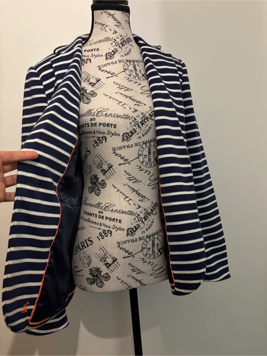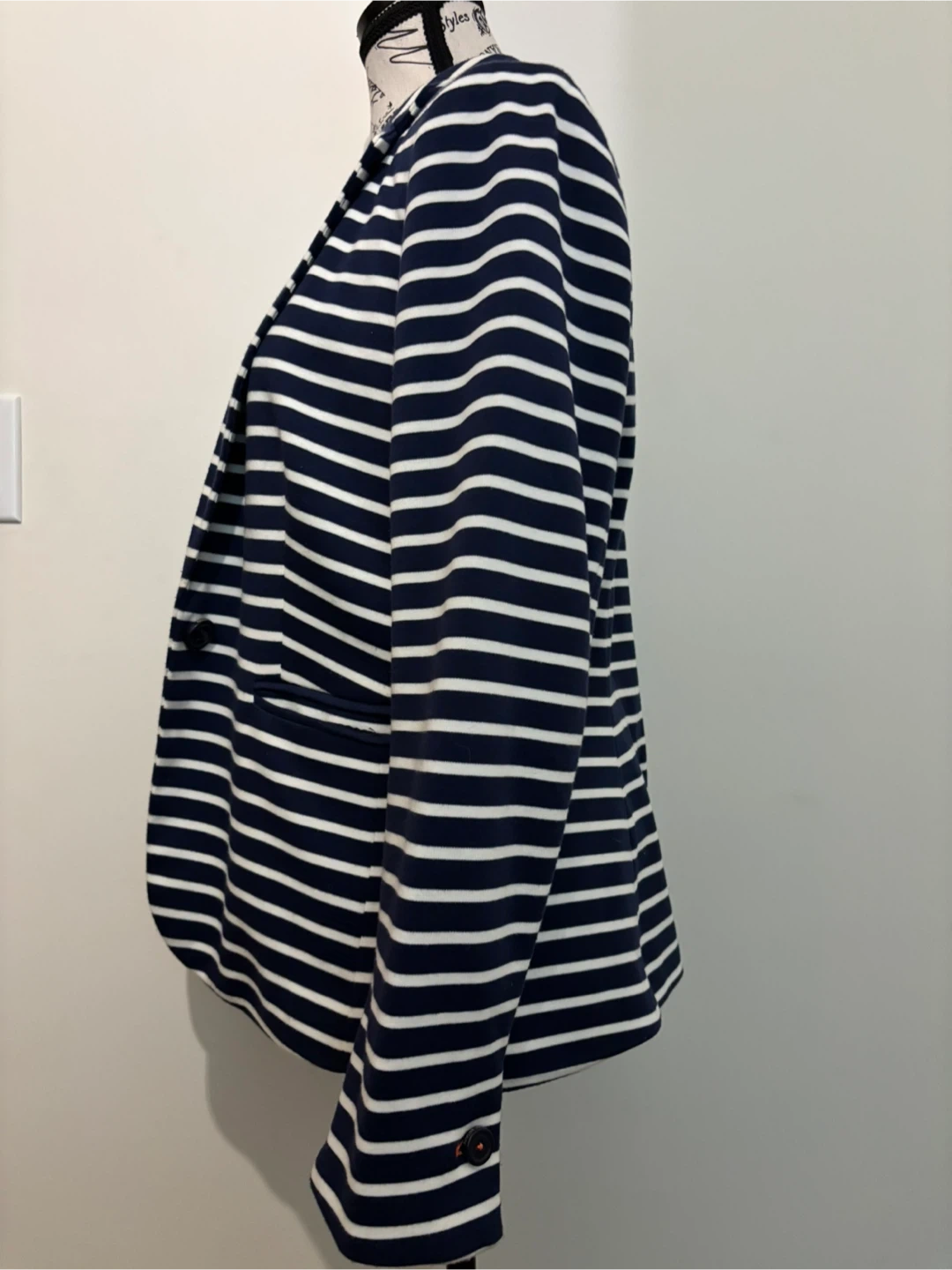 A classic navy and white striped blazer from Joules! It's in great condition and features a stylish pink trim. Perfect for adding a touch of nautical charm to your wardrobe. The material feels lovely and it's a comfortable fit. Size 8 US. Cash only.