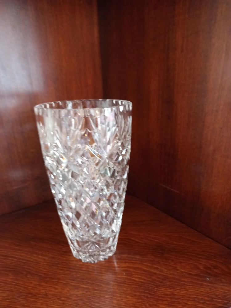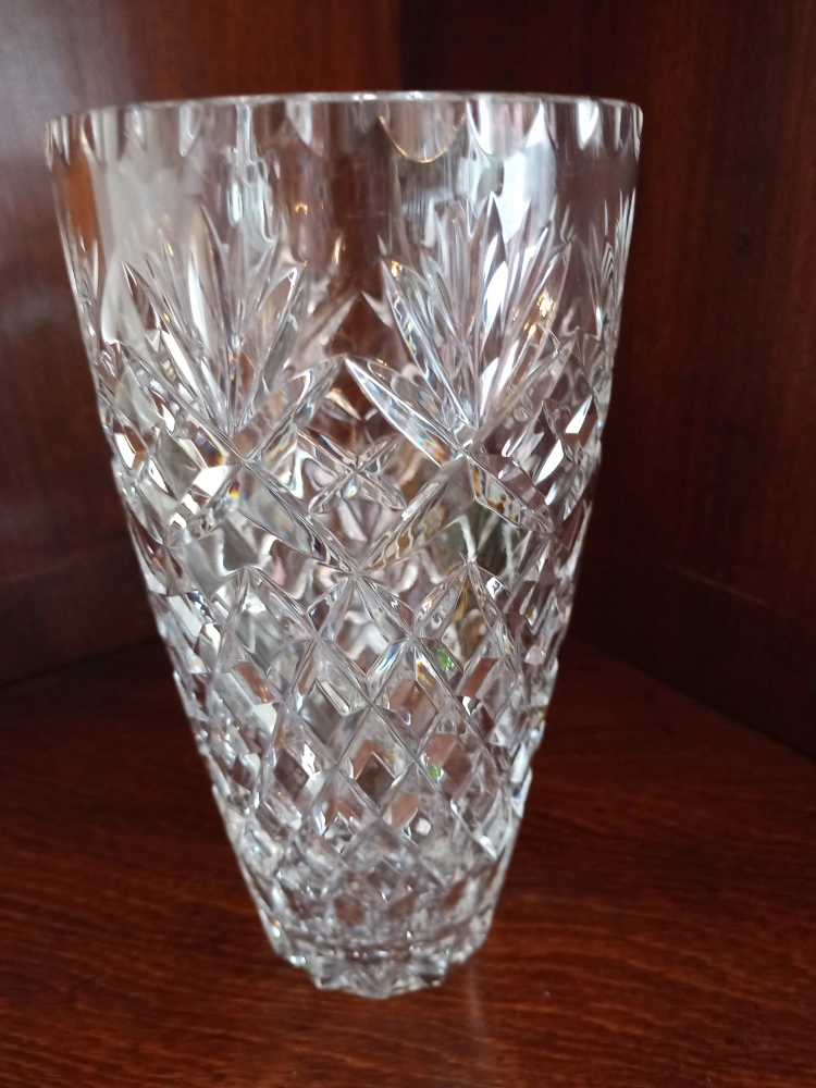 89Selling a beautiful crystal vase. It has an intricate diamond pattern that catches the light wonderfully. Perfect for displaying flowers or as a decorative piece on its own!