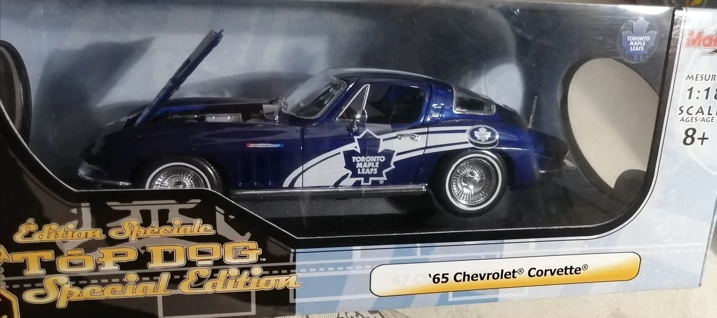 Selling a Top Dog Special Edition '65 Chevrolet Corvette with a Toronto Maple Leafs design! It's a 1:18 scale die cast model and recommended for ages 8+