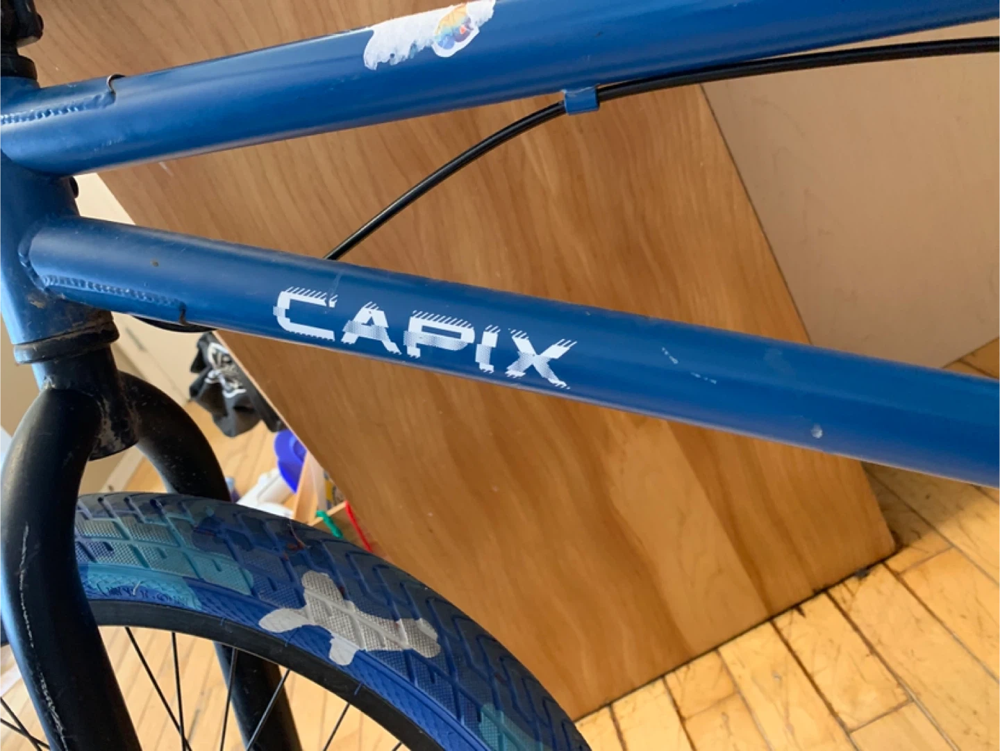 Selling a blue Capix BMX bike. It's in good condition and ready to ride! The tires have a cool blue camouflage pattern. Brakes don’t work and the brake lever is broken.