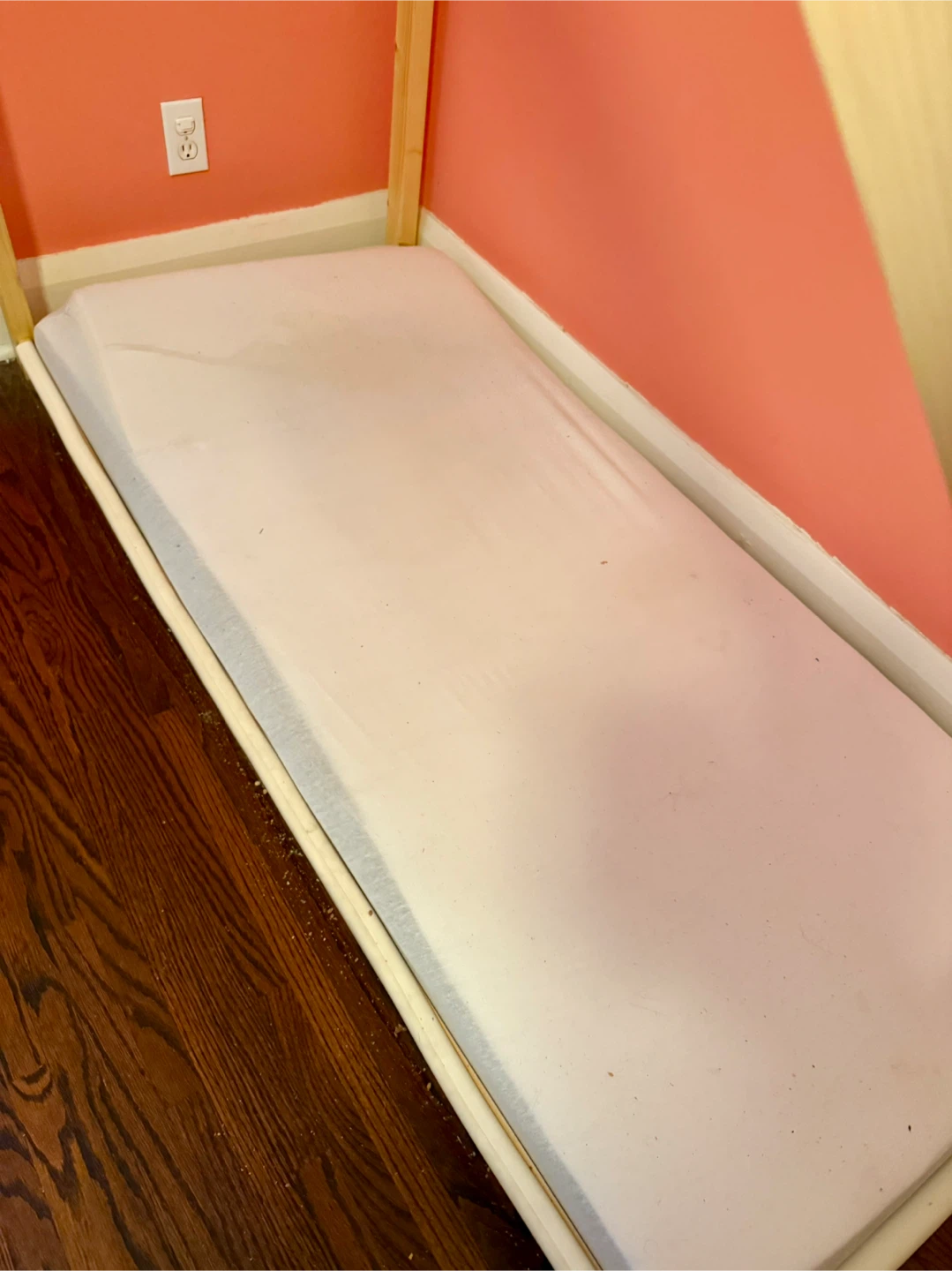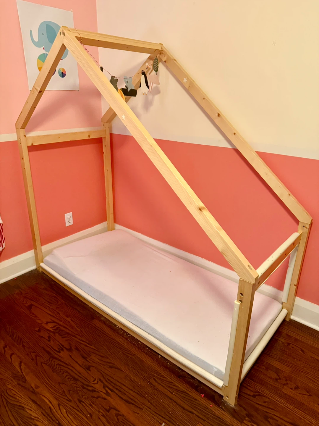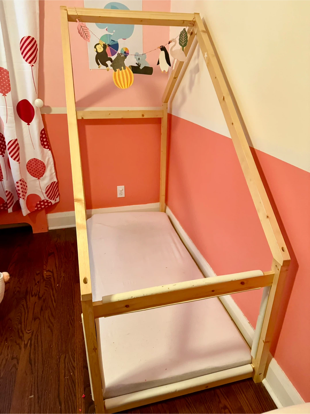 This cute bed is perfect for a nursery (if you are doing early stage floor sleeping) and for toddler and young kids. It's in great shape and ready for a new home. Pine wood with some foam cover on some areas, which can be left on or we can take it off. Comes with toddler size mattress with a jersey cover. Free blanket!