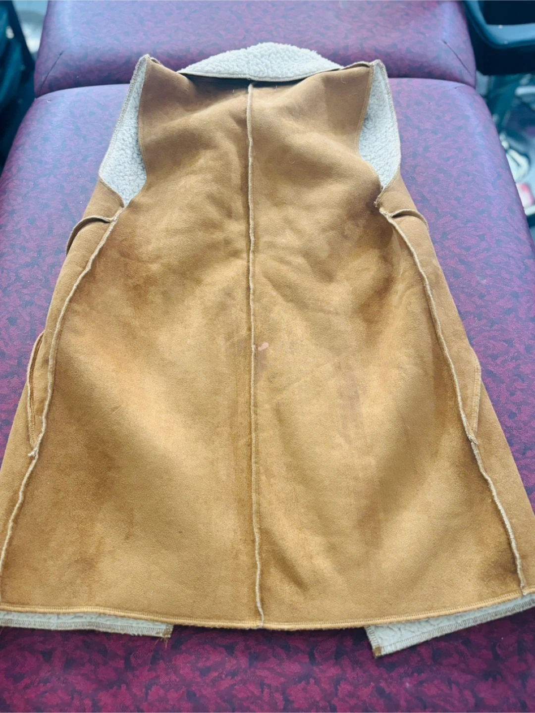 Cozy up in this stylish tan suede vest with a soft sherpa lining! Perfect for layering during those chilly Canadian days. It's a size small and in great condition, ready to add a touch of warmth and style to your wardrobe