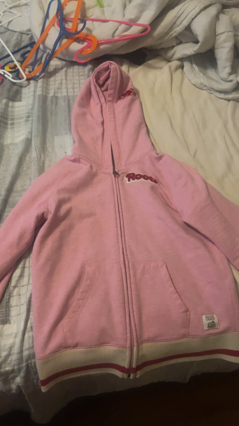 Selling a pink Roots full zip hoodie! It's in great shape and super comfy for those cooler days. The hoodie features the classic Roots logo and a cozy hood. Perfect for casual wear!