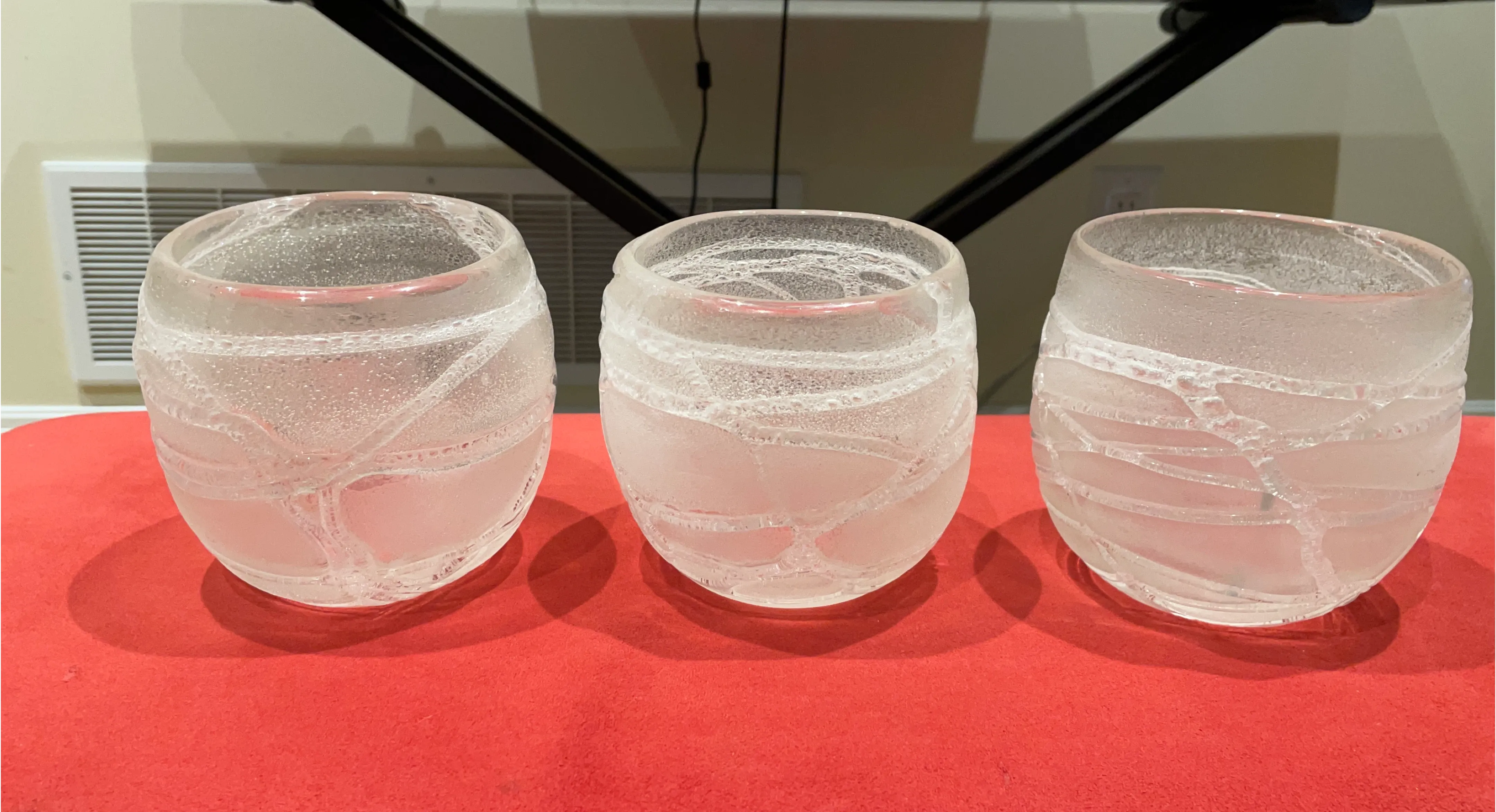 Selling a set of three clear glass vases with a unique textured design. These vases would look great with flowers or as standalone decorative pieces for your home!