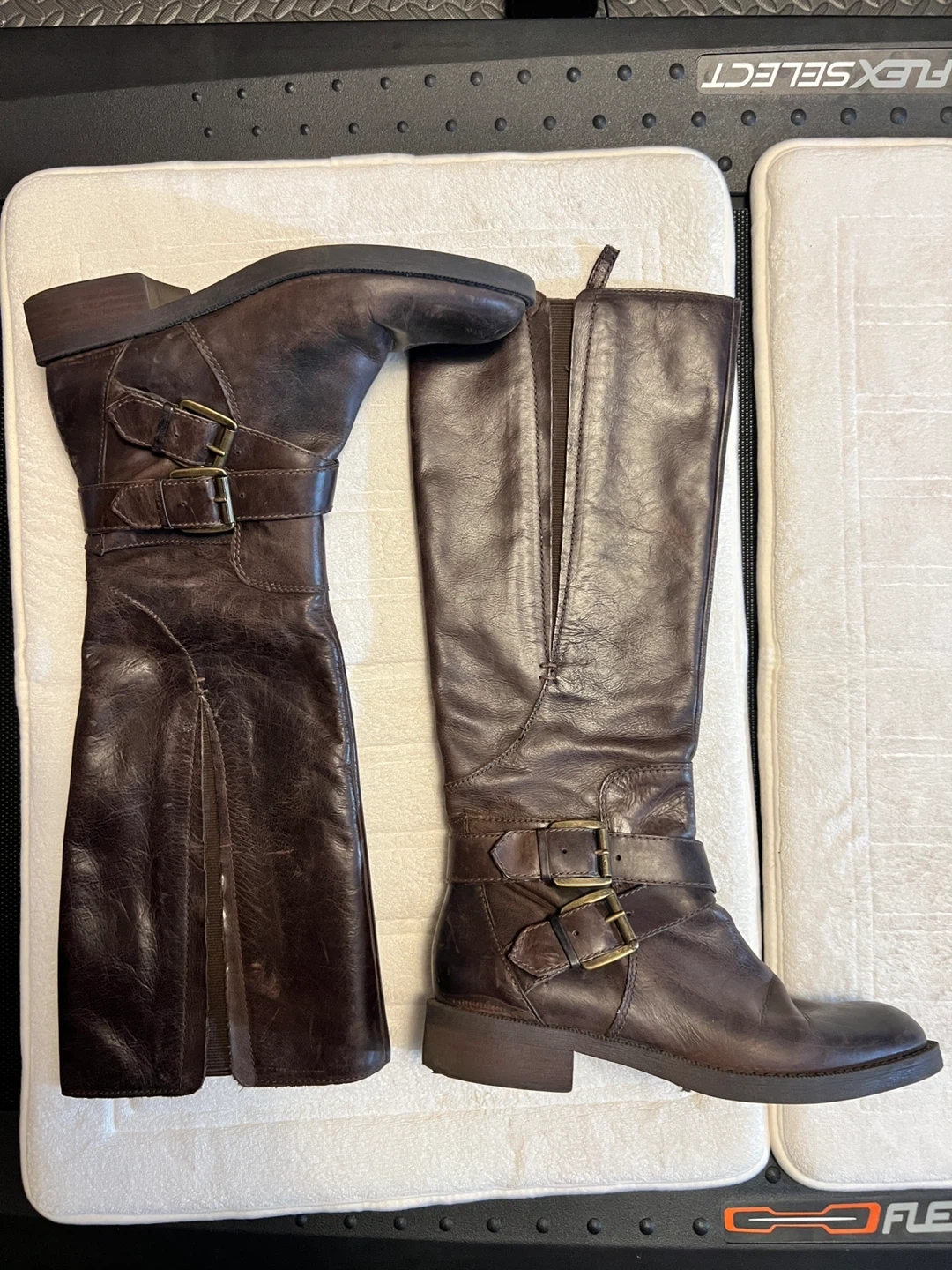 Selling a pair of stylish brown leather riding boots. They feature buckle detailing and a comfortable fit. Full zipper for easy wear. Great leather. Perfect for adding a touch of equestrian chic to your wardrobe!