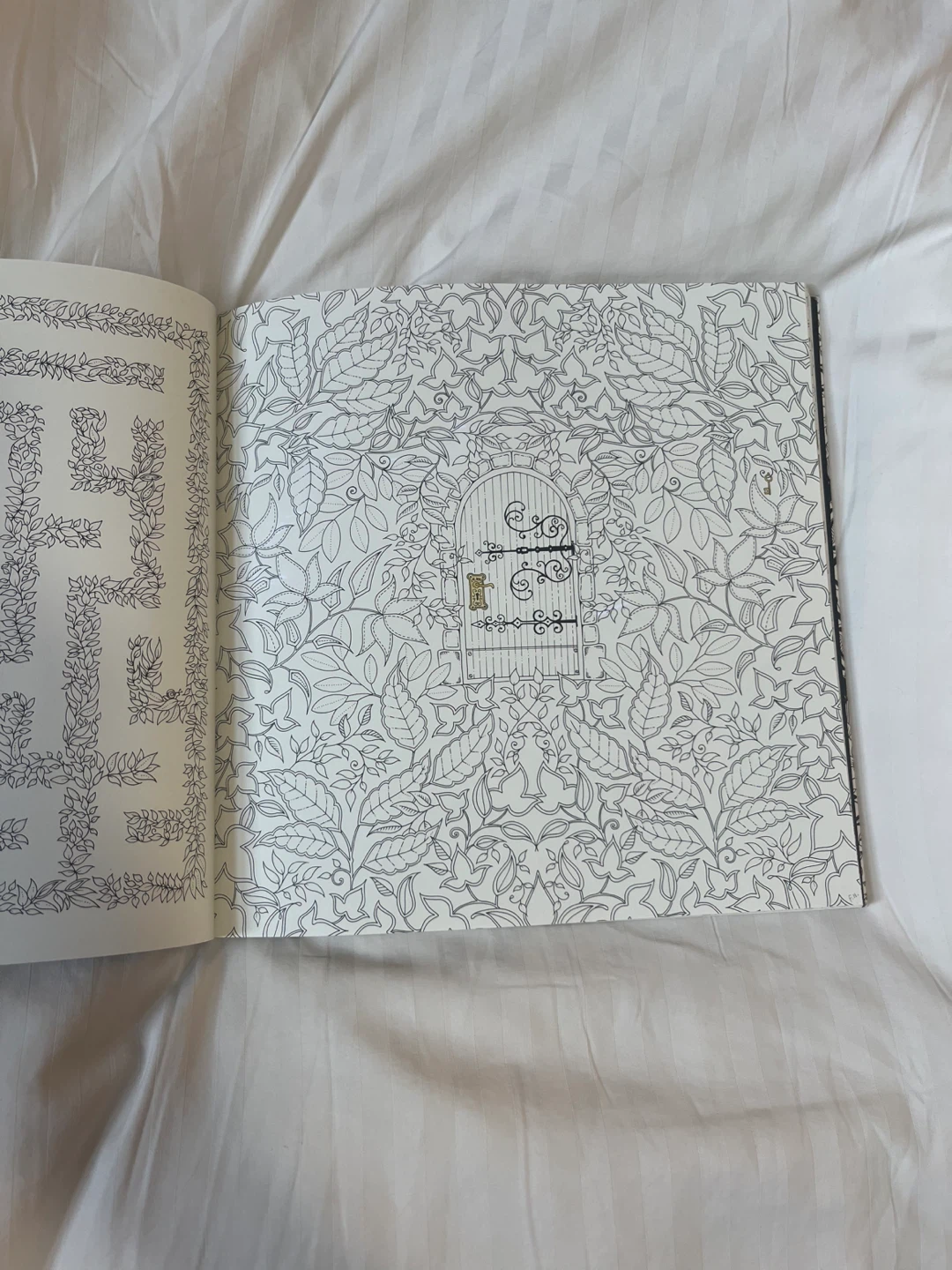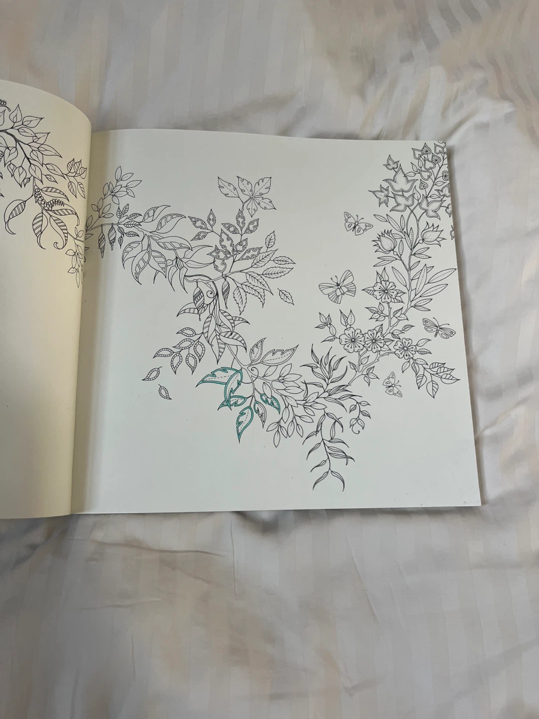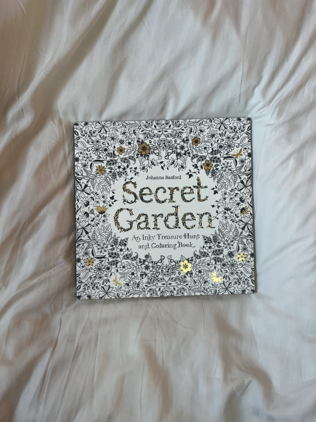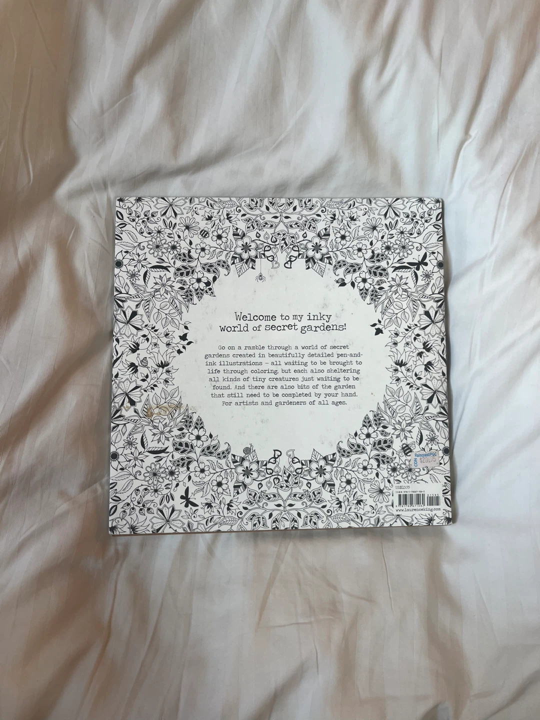 Selling a used Secret Garden coloring book by Johanna Basford. It's an inky treasure hunt and coloring book, perfect for artists and gardeners of all ages. Some pages have been colored in, as shown in the photos. Retailed at $20.95.