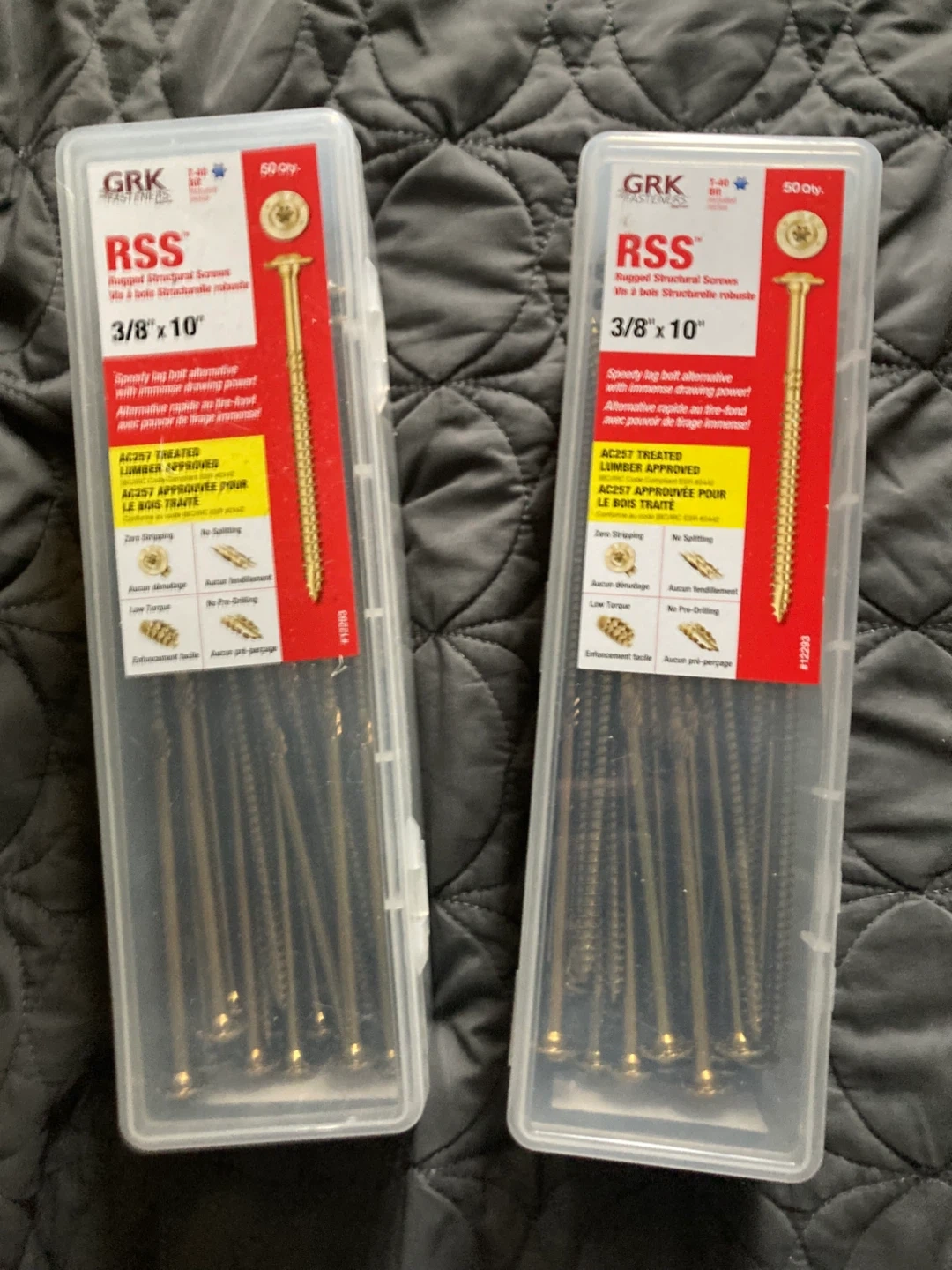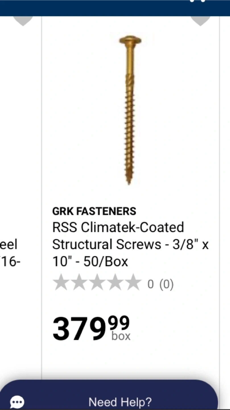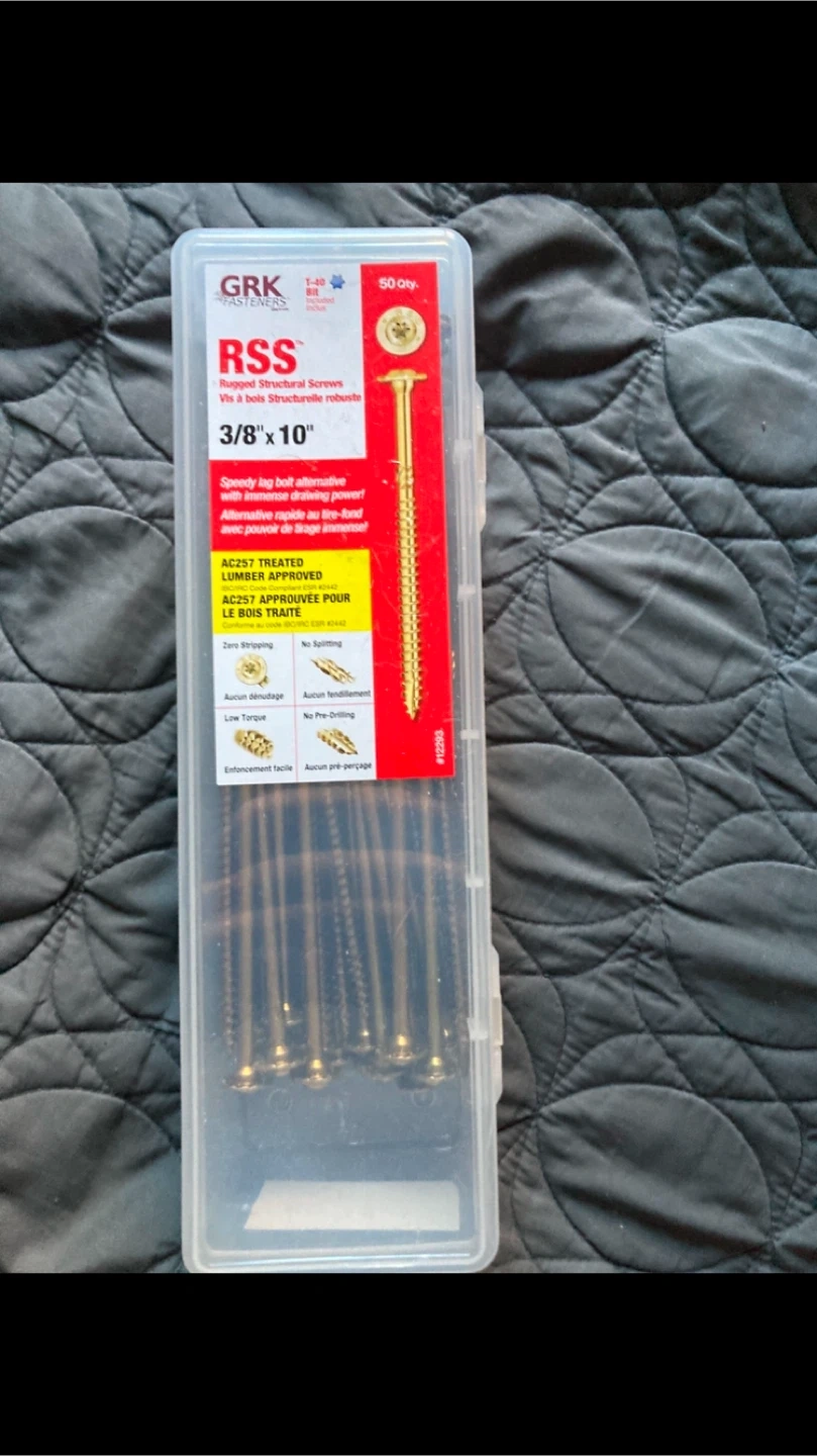 76These are brand new packs of GRK RSS Timberlock screws. They are 3/8” x 10” Each pack has 50 screws and comes with a T40 bit included in the pack. These are structural engineered screws with a zero stripping T40 head and no pre drilling needed. These are $379 plus tax in store which is $400 with tax per pack but I’m only asking $140 each box FIRM
