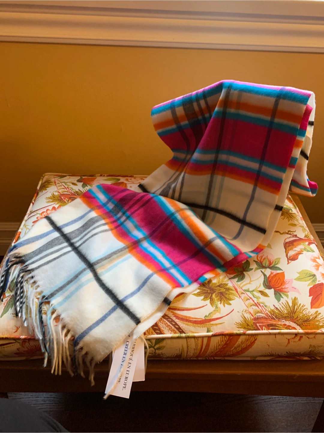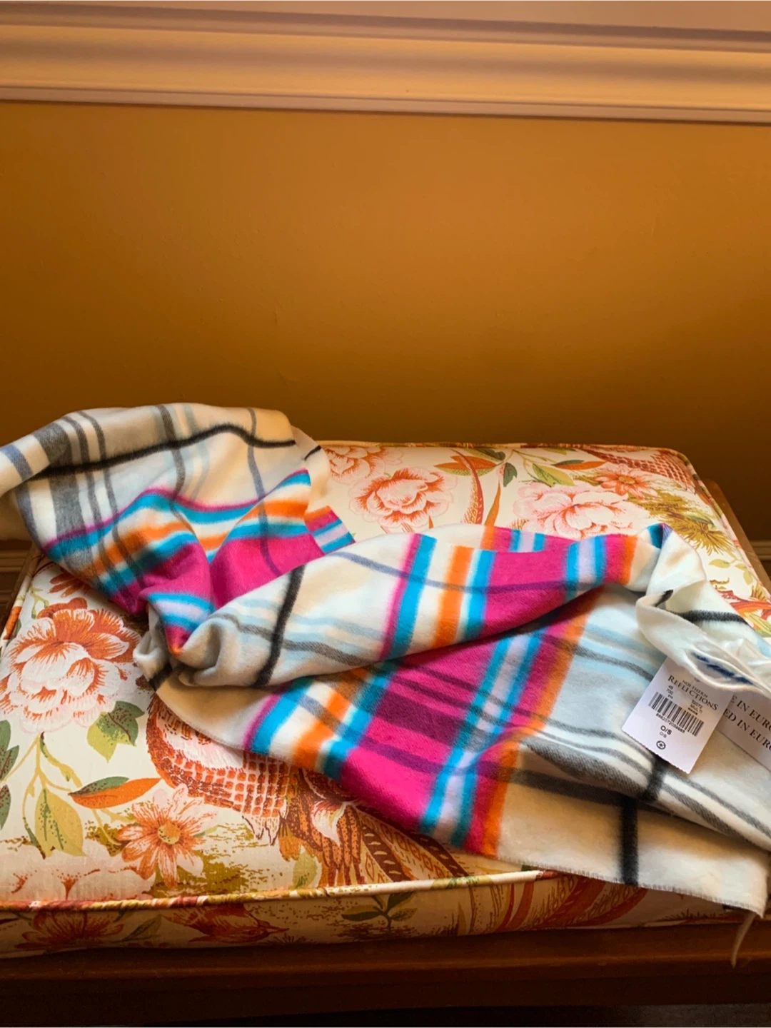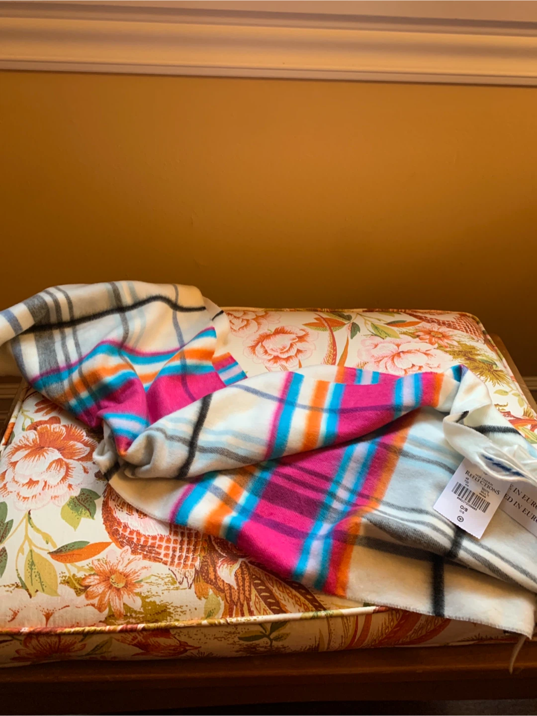 BNWT Northern Reflections scarf in size O/S. It's made in Europe and is 100% acrylic. It features a colourful plaid pattern, in pink, cream, blue and grey. A nice pop of colour for your coat or chunky knit sweater! It is just a bit over 5’ long. Cozy up with this item!