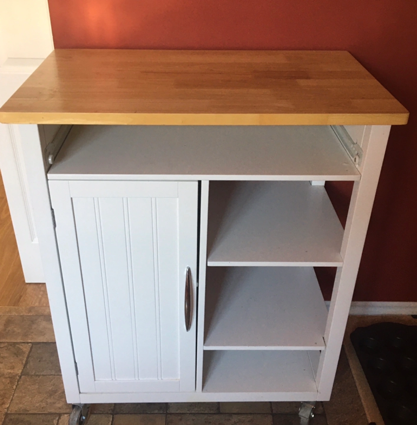 This kitchen cart offers a blend of functionality and style, perfect for adding extra storage and workspace to your kitchen; its condition reflects careful use. Featuring a durable butcher block top, a cabinet with adjustable shelving, and open shelves, it’s designed to maximize space. The cart also includes wheels, making it easy to move around your kitchen as needed.