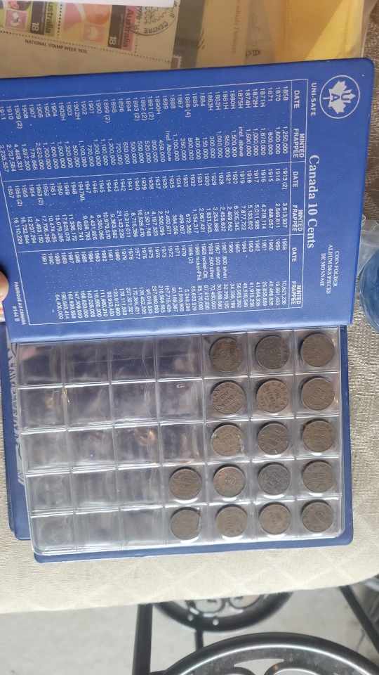 Selling a coins Album with 17 coins, in good condition, filled with ancient 1 cent coins on one page, in good condition! Basically the Album is designed for 10 Cents Canadian!