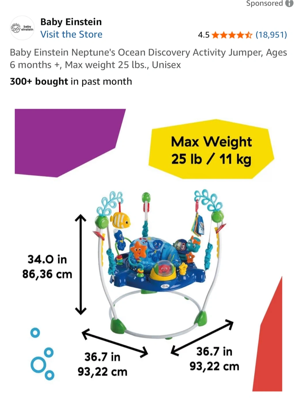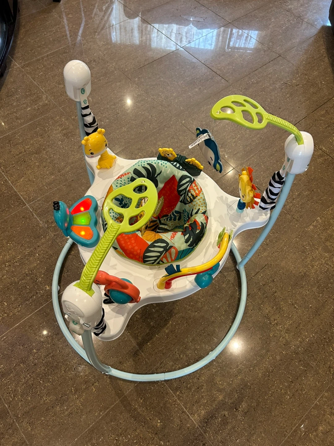 Selling a gently used Baby Einstein Neptune's Ocean Discovery Activity Jumper. It's in great condition and ready for a new little one to enjoy! It features lots of fun toys and activities to keep baby entertained. Perfect for ages 6 months and up, with a max weight of 25 lbs. Unisex design.