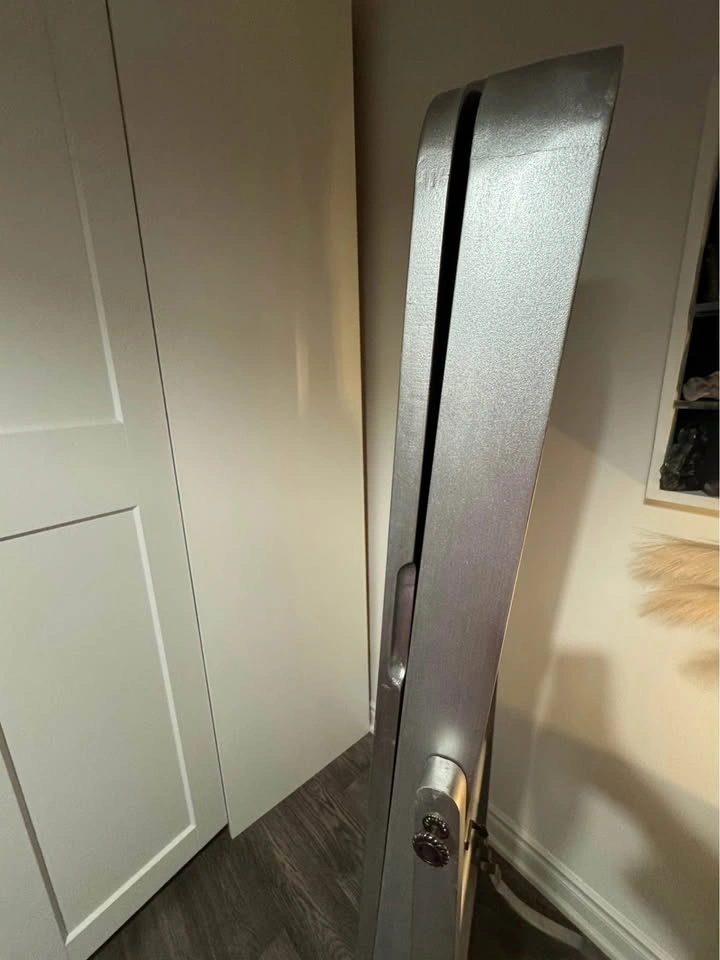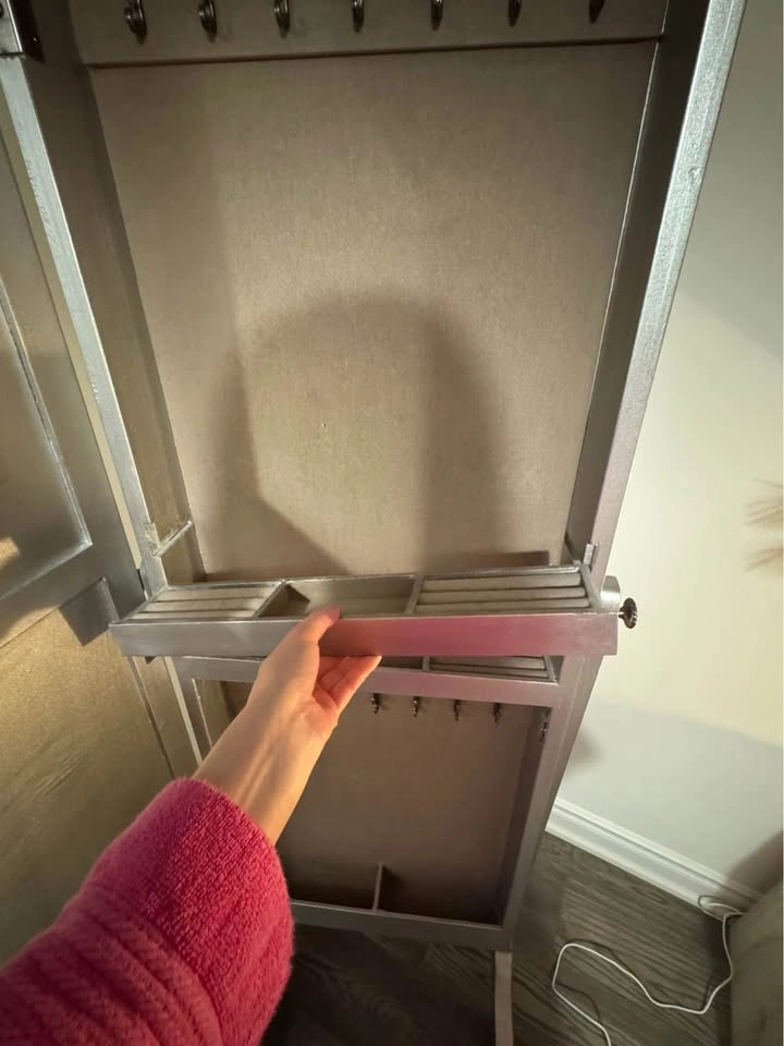 Hayworth floor mirror with jewellery storage inside. Silver mirrored finish pier one Hayworth collection. 66.5 inches tall. 22.4 inches wide at its widest point. Vintage looking, silver, finish slightly warped at the top but natural for wood furnishing.