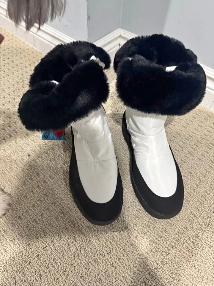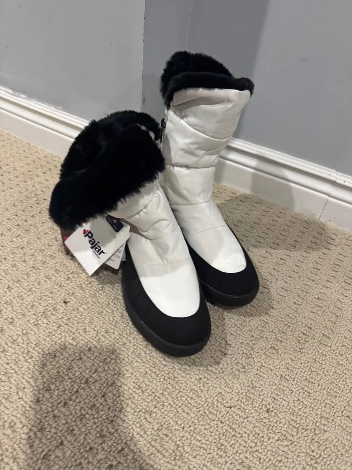 26New still have tags on. white and black Pajar boots. Size 8-8.5. Fold down top. Ice grip flip bottom with flip key.