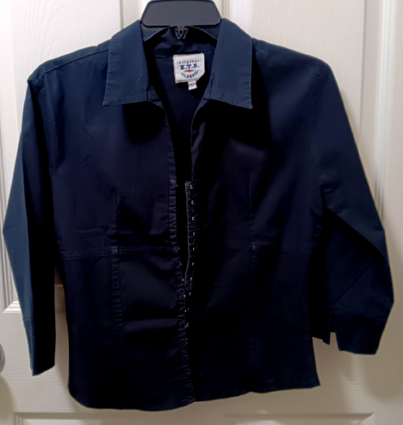 Add a touch of vintage charm to your wardrobe with this ATS Classics black blouse, size medium! This fitted blouse features a unique front, 3/4 sleeves, and is in good used condition, ready to make a statement.
