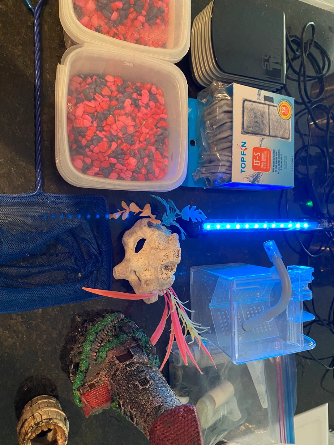 154Selling a variety of fish tank accessories! Includes a Fluval Q5 filter, Top Fin EF-S filter cartridges (8 count), breeder box, two containers of gravel, a net, and various decorative pieces for your aquarium
