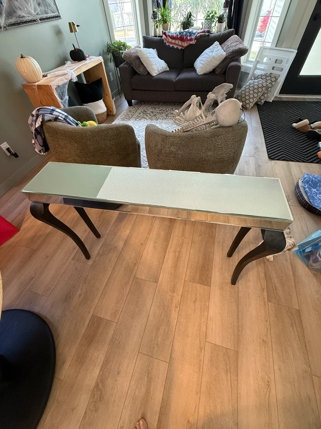 Selling a console or hall table. It features a sleek design with a mirrored top and dark, curved legs. Perfect for adding a touch of elegance to your entryway or living space!