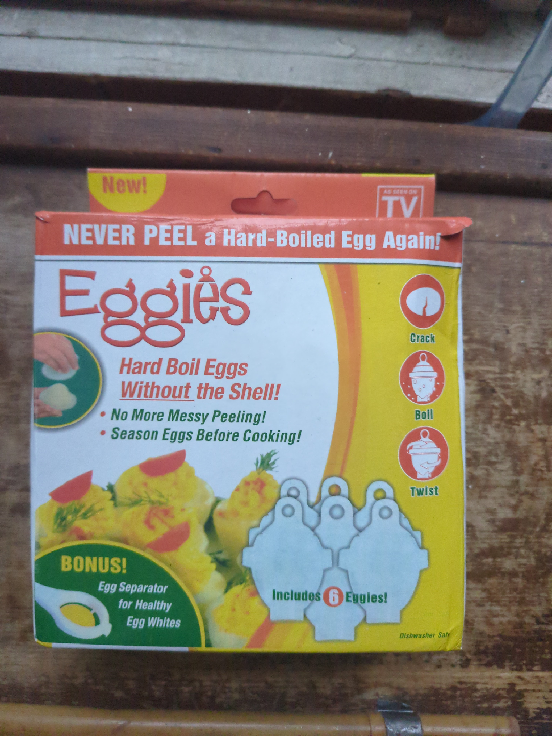 I'm selling a brand new set of Eggies! These let you hard boil eggs without the shell, so no more messy peeling! You can even season the eggs before cooking. This set includes 6 Eggies and a bonus egg separator for healthy egg whites