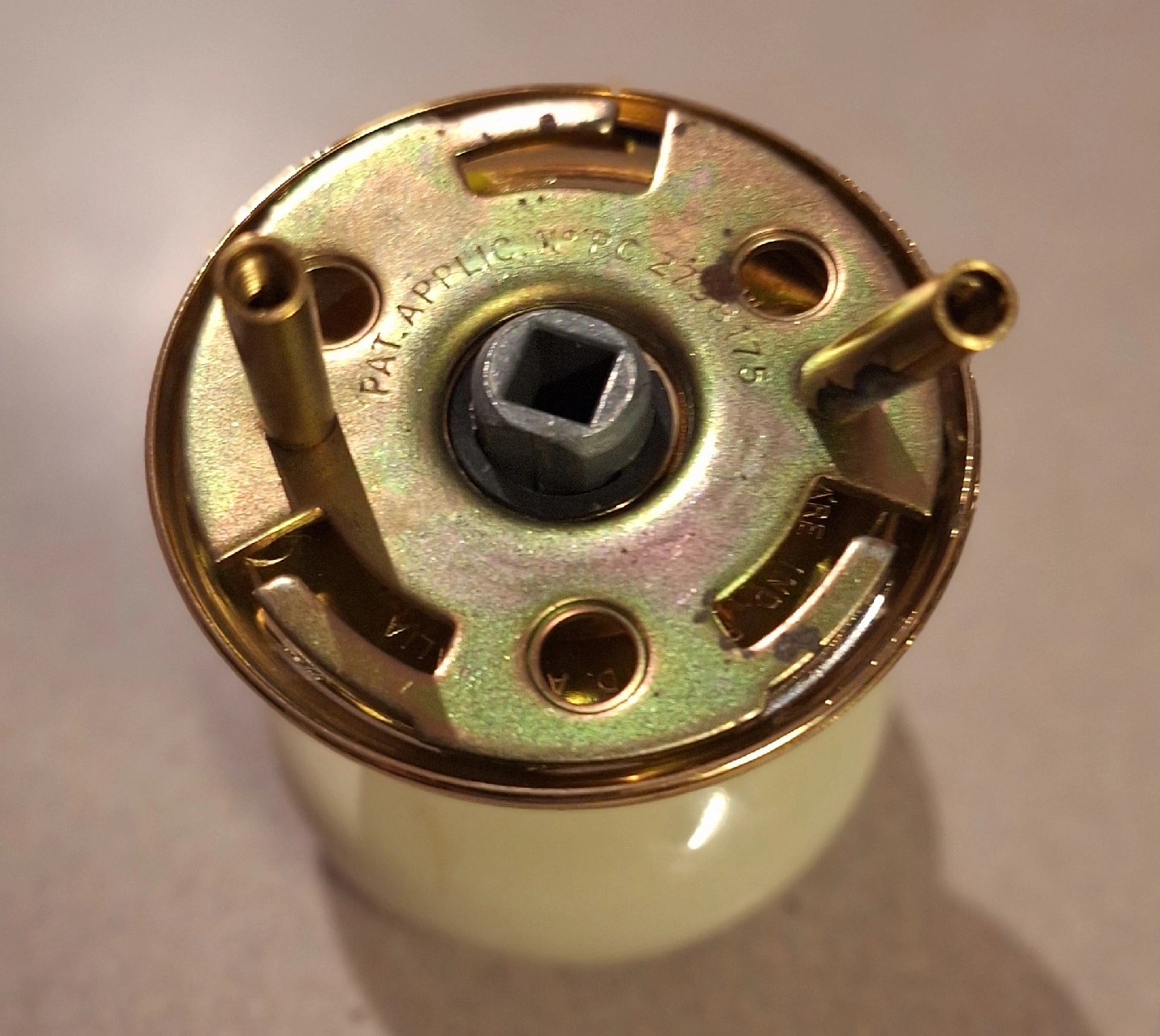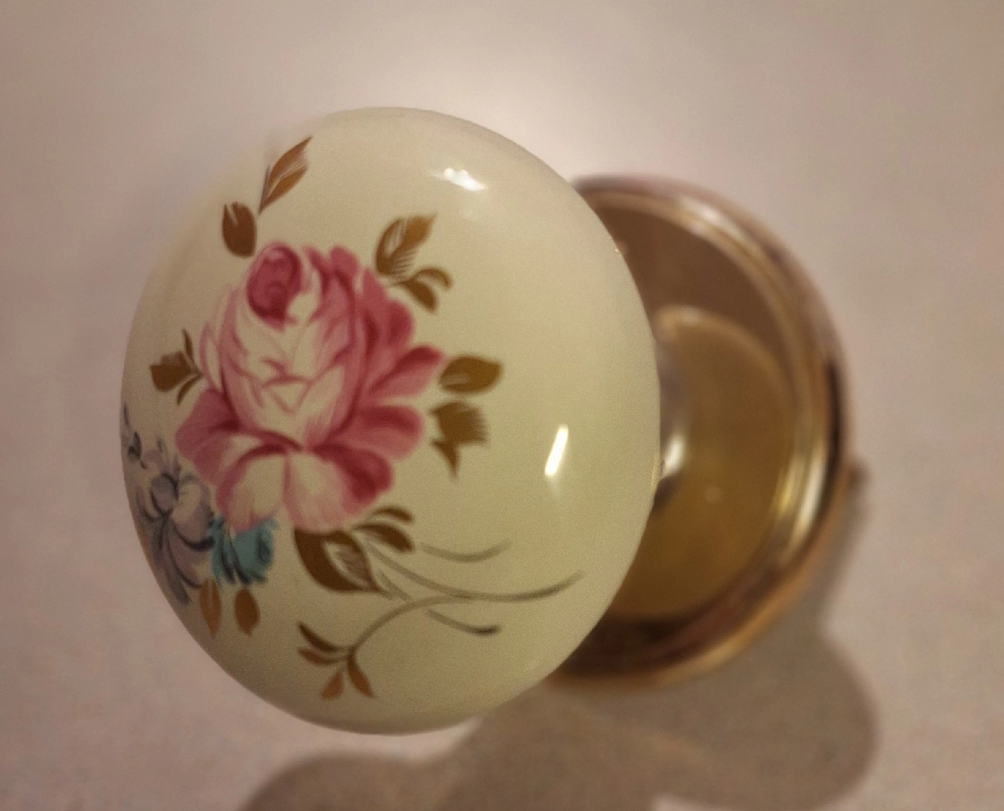 71Selling a vintage door knob with a lovely floral design! It features a ceramic knob with a pink rose and blue flower pattern, accented with gold-coloured leaves.