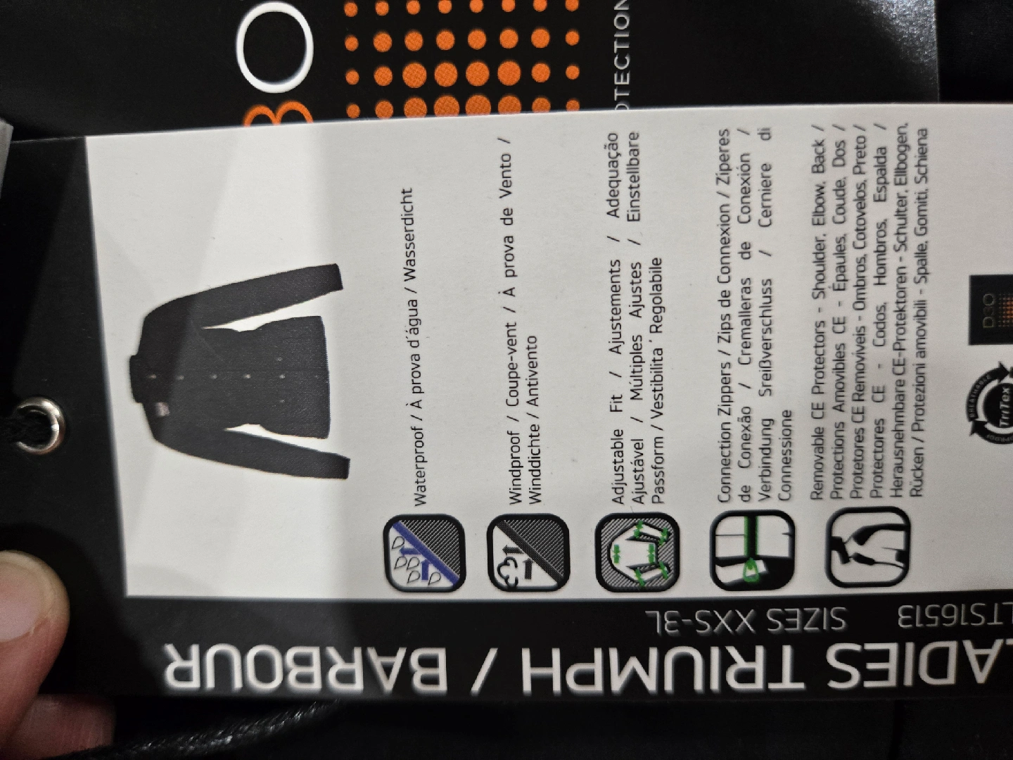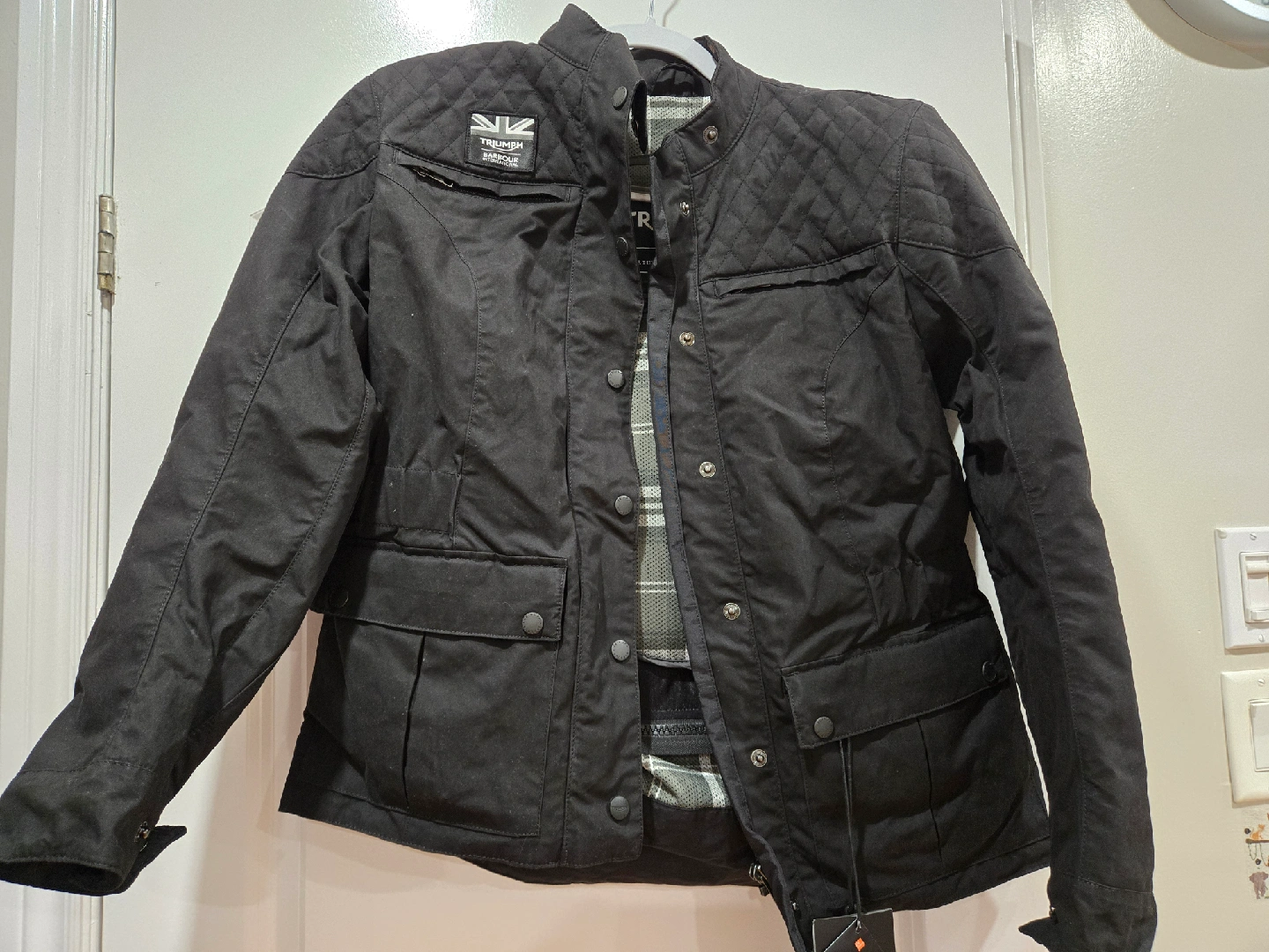 Selling a ladies Barbour Triumph waxed motorcycle jacket from U.K. that comes with D3O impact protection! This jacket is perfect for staying safe and stylish on your rides. The jacket is black with checkered liner. It has a quilted design on the upper chest and shoulders.
