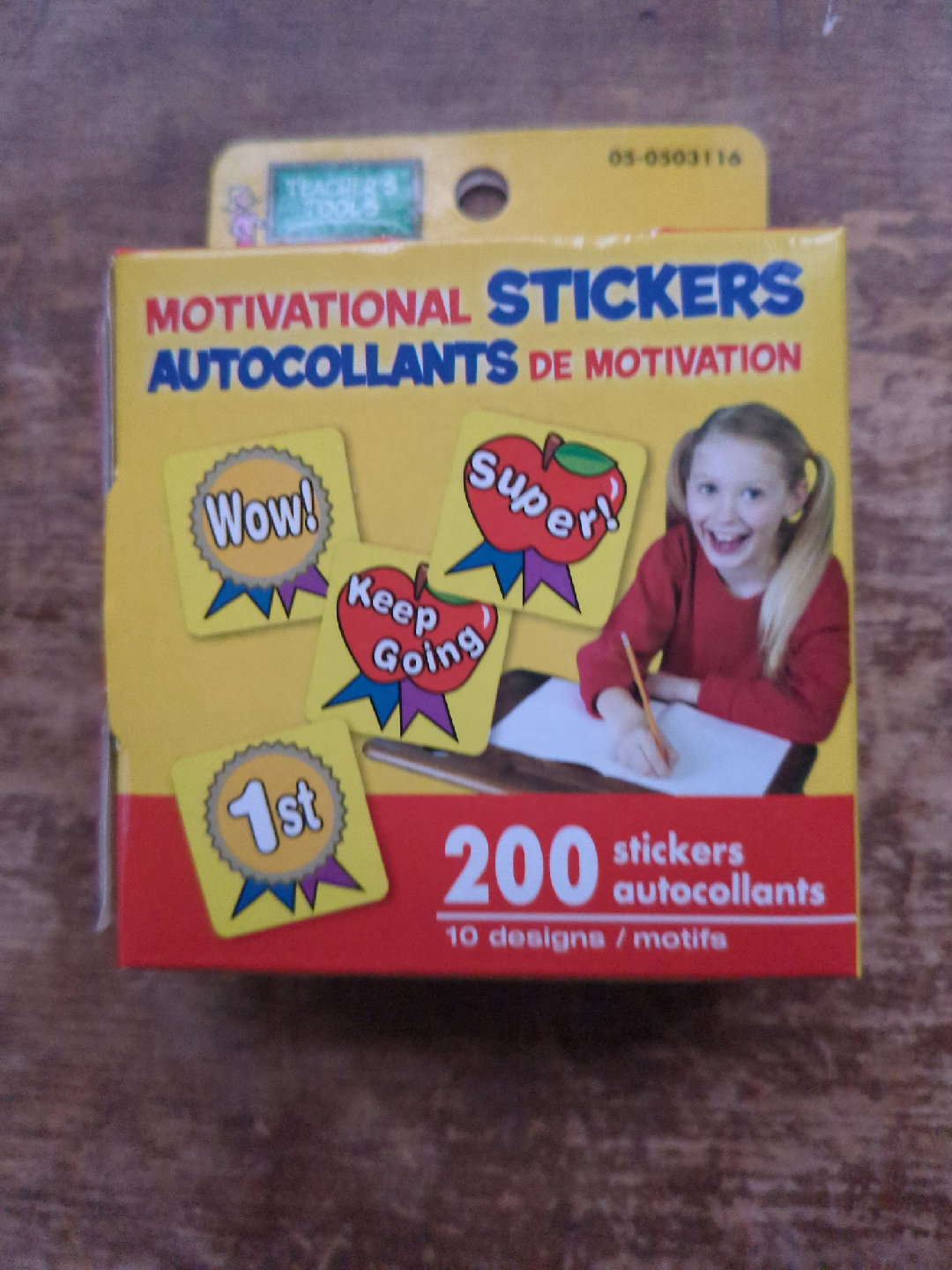 I'm selling a box of motivational stickers! It has 200 stickers with 10 different designs/motifs. Great for teachers or parents.