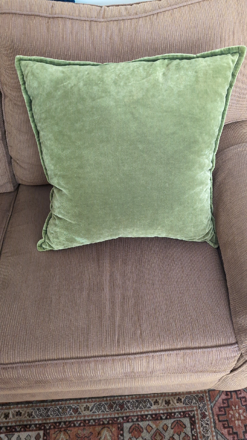 Selling a set of two decorative pillows in a lovely green velvet material. They're in great shape and would add a nice touch to any living space! They are soft and comfortable. Price is per cushion.