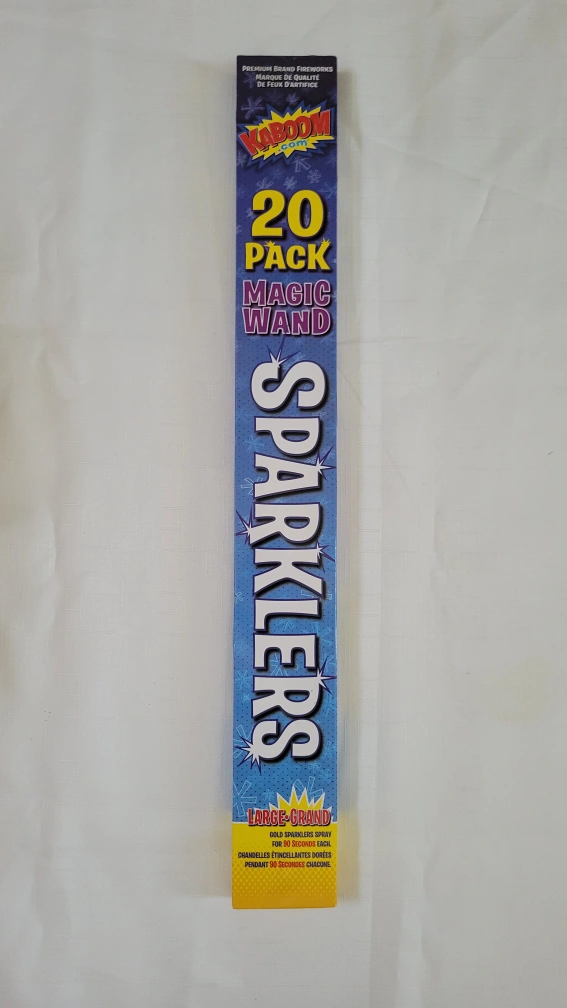 Brand bew pack of 20 large 20" magic wand soarklers. These Kaboom's Magic Wand sparklers are perfect for long nights of fun and spell-casting. This large 20" sparklers spray colourful sparks for about 90 seconds allowing you plenty of time to create sparkling patterns and designs in the air.