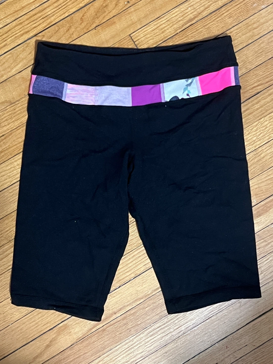 Lululemon biker shorts in black. They are size 4 and in great condition. The waistband has a nice colourful pattern. Perfect for workouts or casual wear! There is minor pilling but still lots of life left!