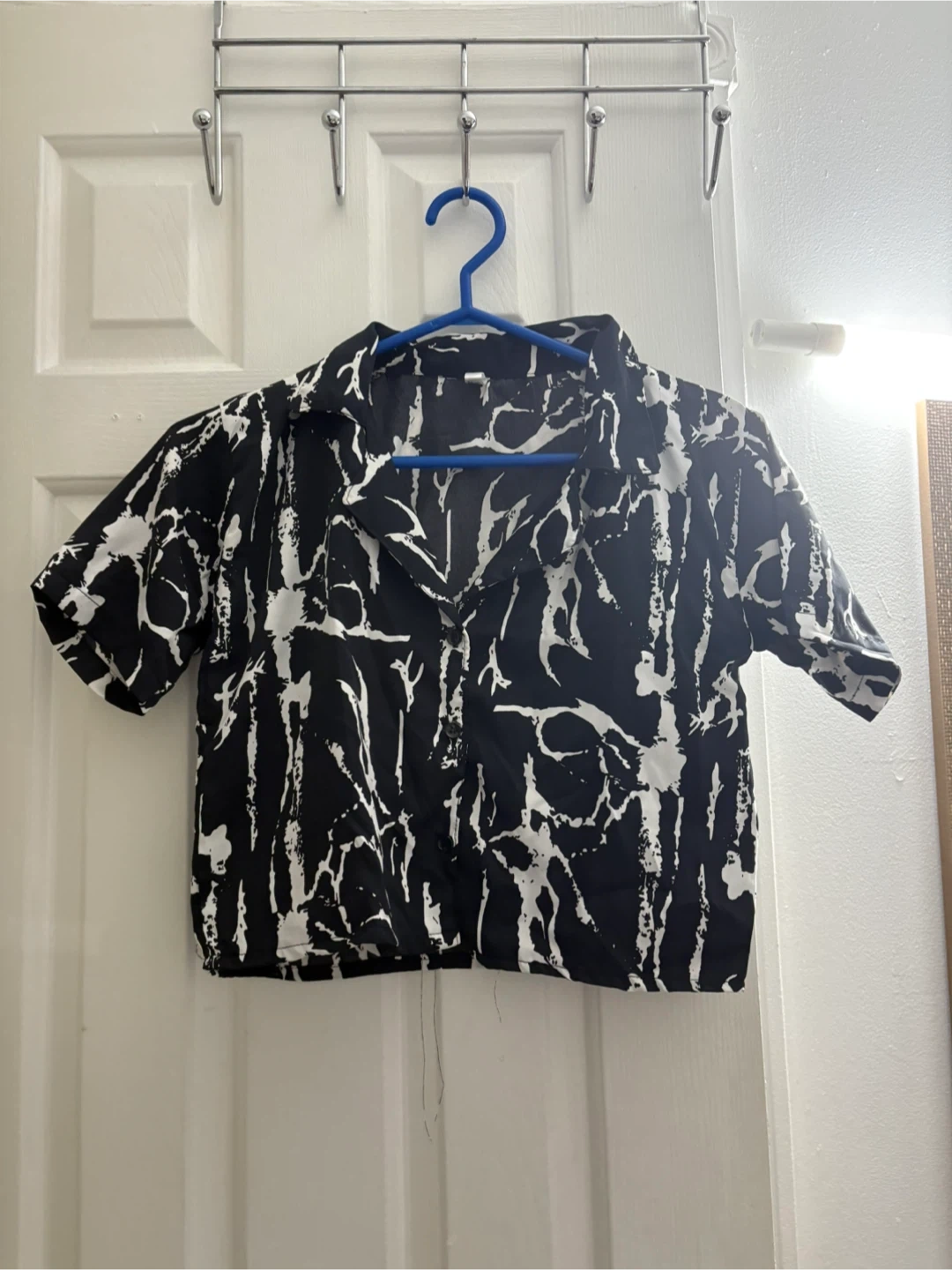 65Here's a fun black and white patterned short sleeve shirt! It's perfect for adding a bit of flair to your wardrobe. It's in great condition and ready for a new home